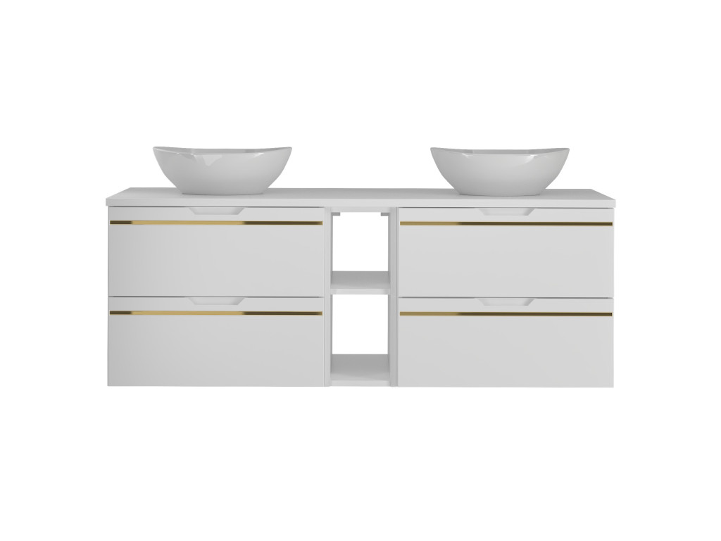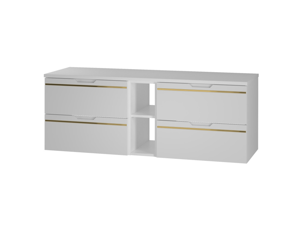 Skrinka pod umývadlo s poličkou Espero 02 140 ponúka štyri priestranné zásuvky a stredovú otvorenú poličku, v ktorých pohodlne uložíte všetky kúpeľňové potreby. Jej biely matný povrch zdobí zlatý pás, čo dodáva celkovému dizajnu moderný a luxusný nádych. Zásuvky sa otvárajú pomocou zafrézovaných úchytov, pričom polovýsuv a tiché dovieranie zabezpečujú pohodlné každodenné používanie. Skrinka je dostupná v 2 variantoch, aby ste ju mohli jednoducho prispôsobiť svojim predstavám.
