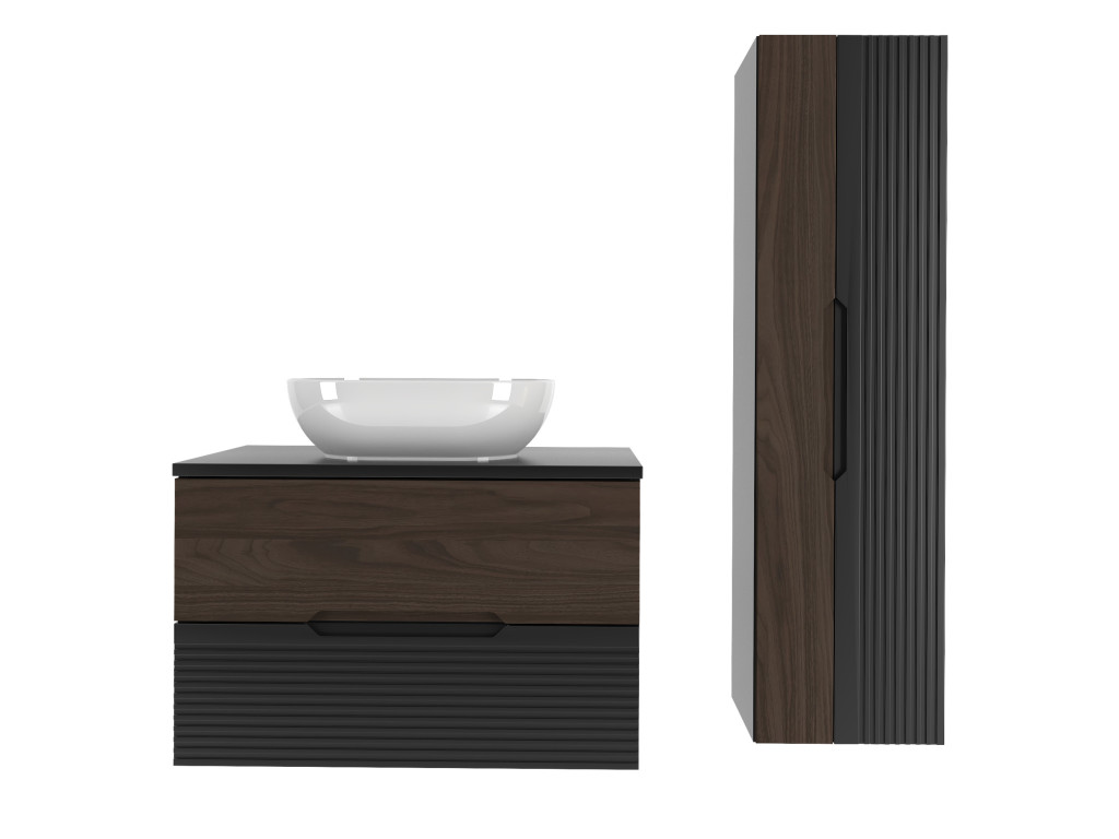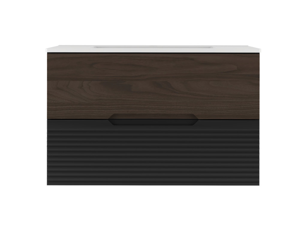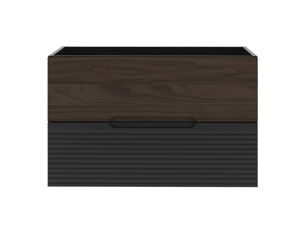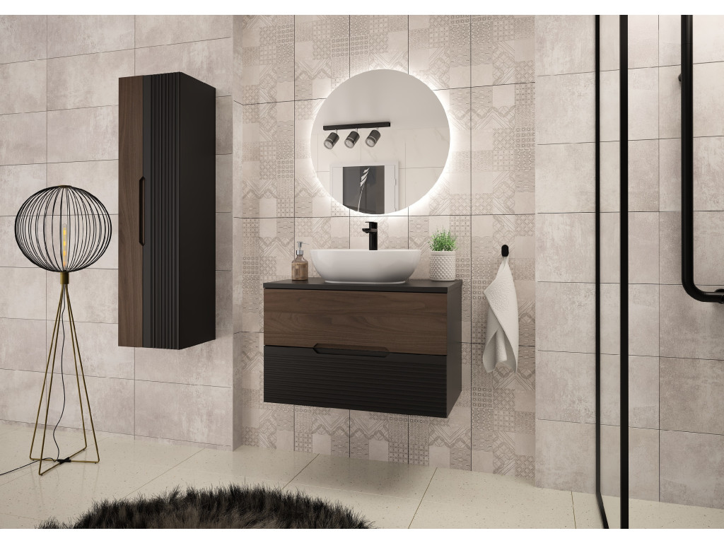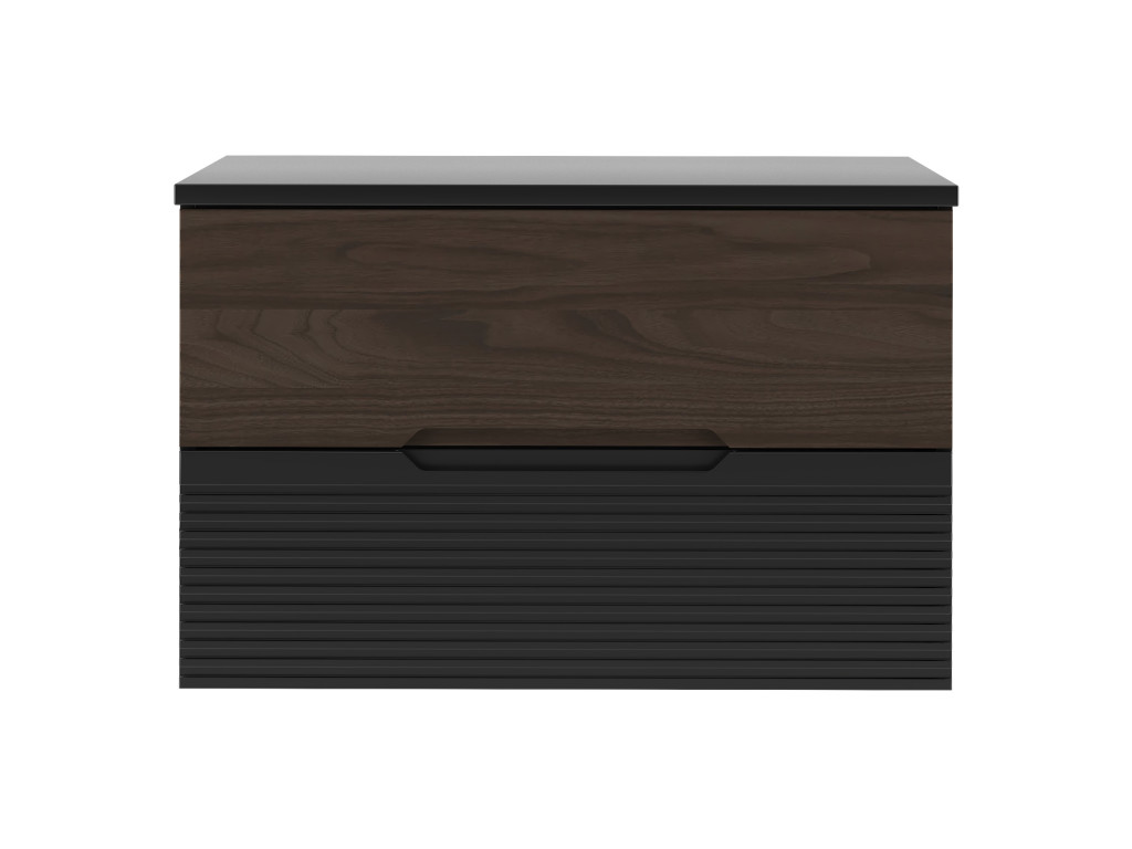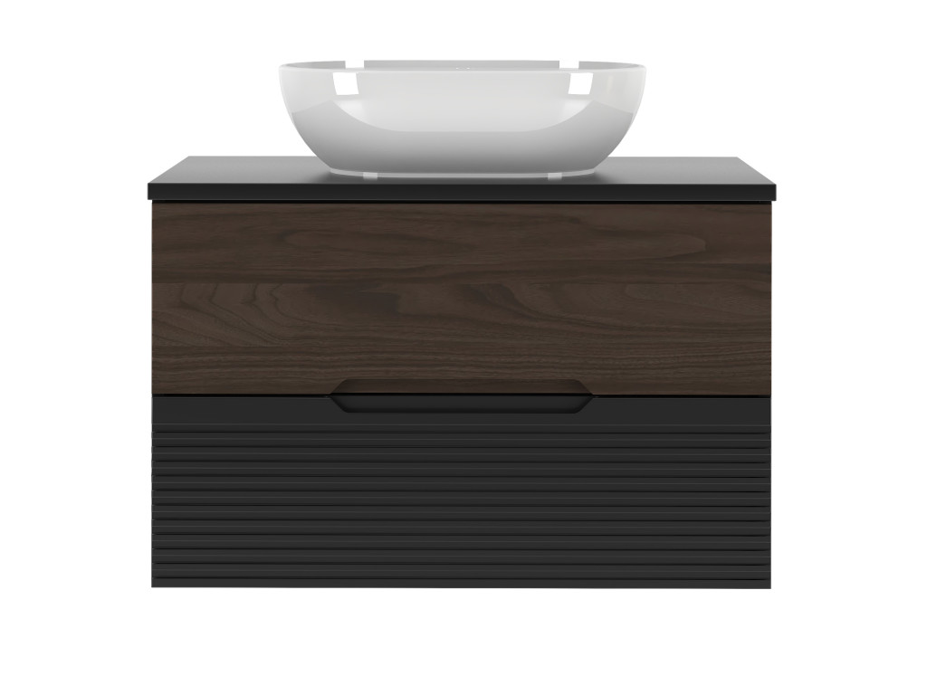 Kúpeľňová skrinka Avela 01 so šírkou 80 cm spája elegantný orechový dekor na hornom zásuvke s matnou čiernou a vodorovnými zárezmi na spodnom zásuvke. Dizajn bez úchytiek, dostupnosť v štyroch variantoch – bez dosky, s doskou, s umývadlom na dosku alebo zápustným umývadlom – a závesné prevedenie robia z tejto skrinky praktickú a štýlovú voľbu pre každú kúpeľňu.