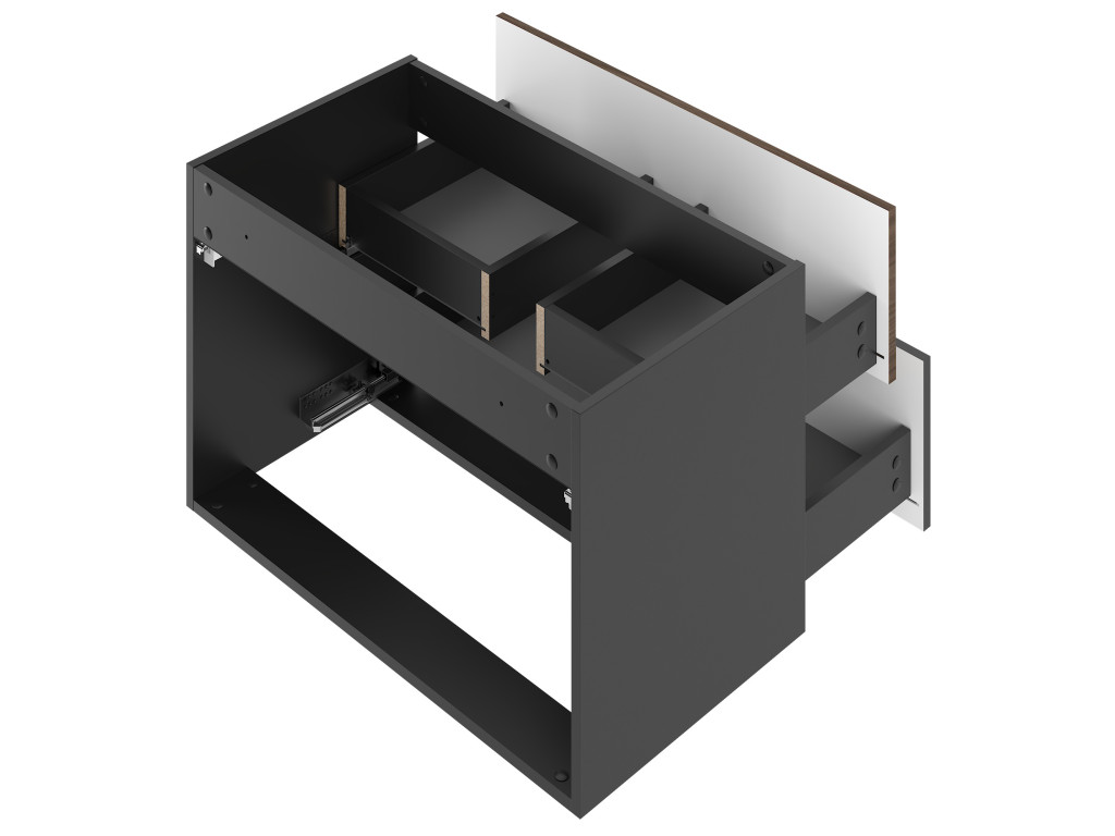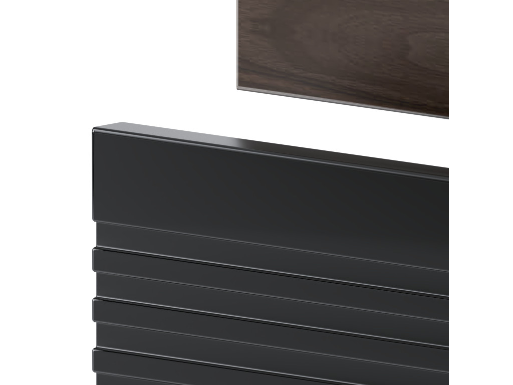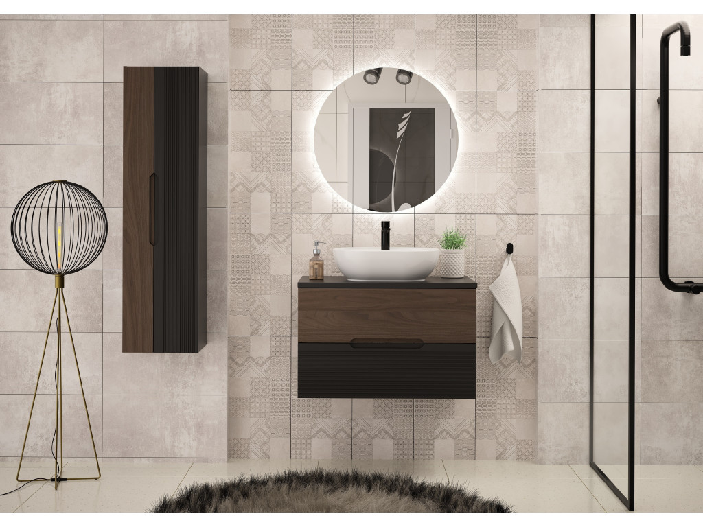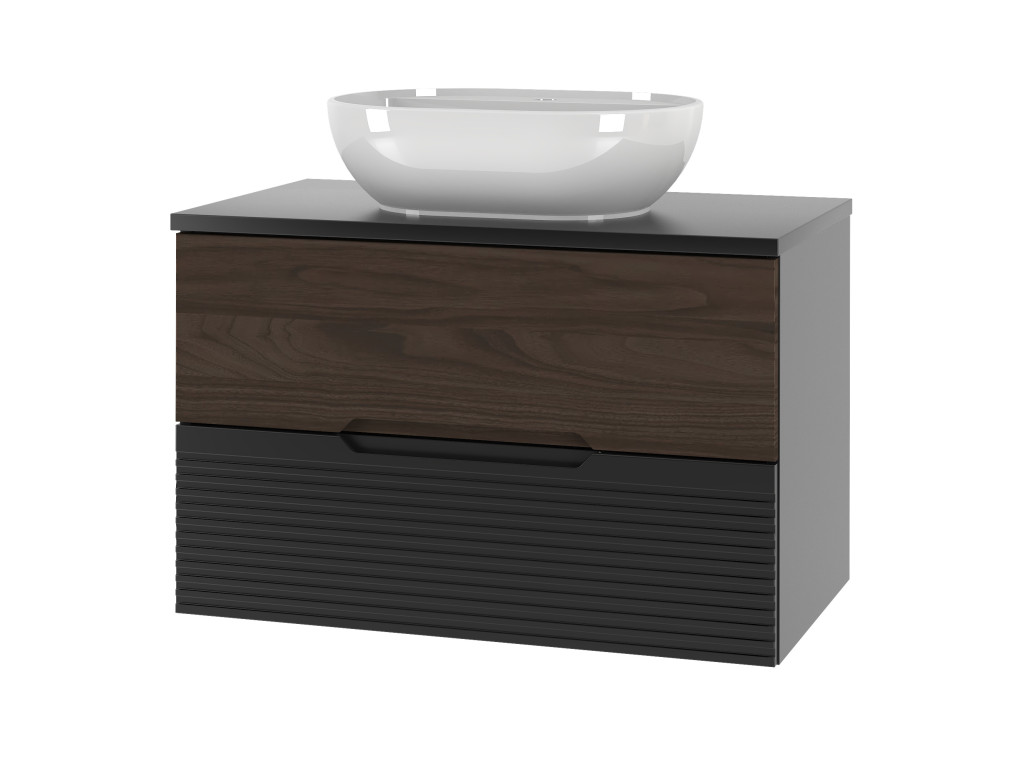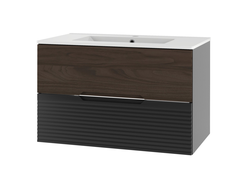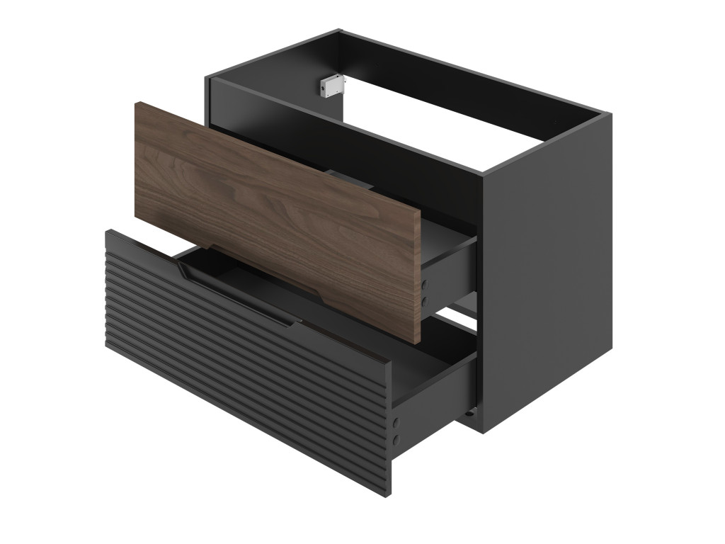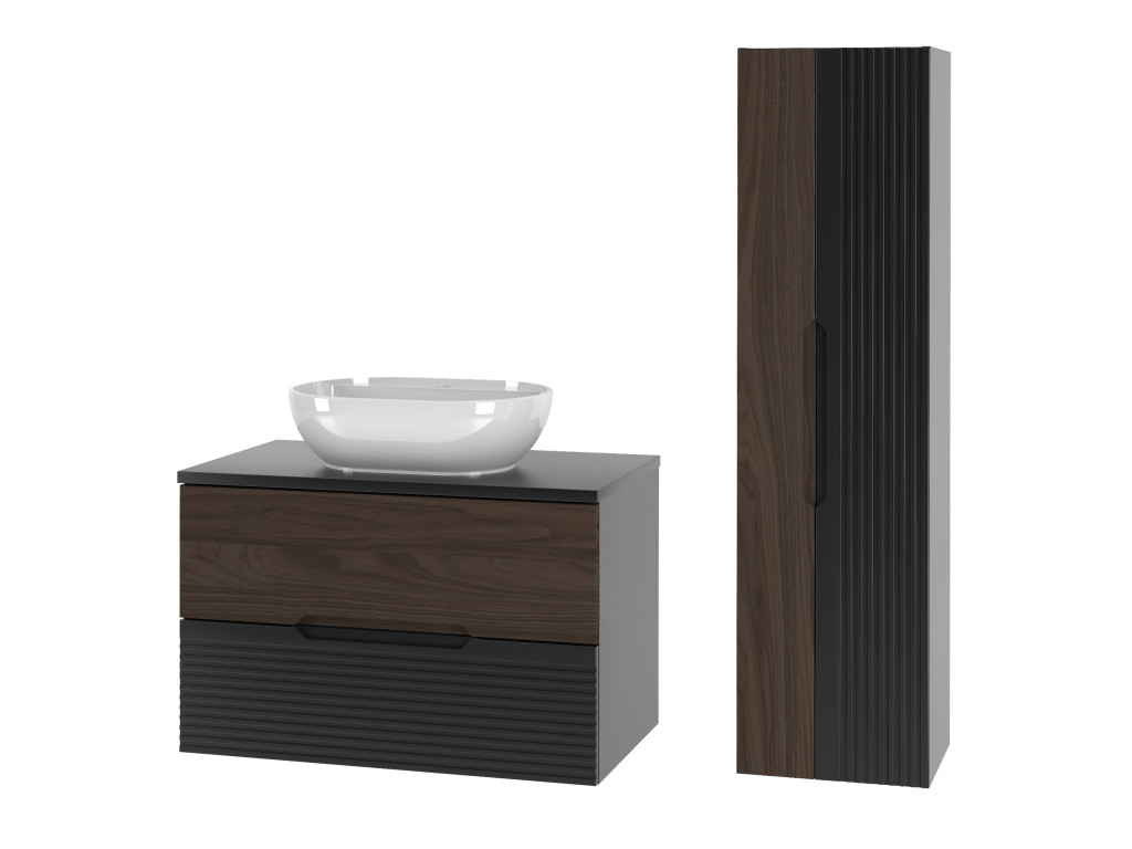 Kúpeľňová skrinka Avela 01 so šírkou 80 cm spája elegantný orechový dekor na hornom zásuvke s matnou čiernou a vodorovnými zárezmi na spodnom zásuvke. Dizajn bez úchytiek, dostupnosť v štyroch variantoch – bez dosky, s doskou, s umývadlom na dosku alebo zápustným umývadlom – a závesné prevedenie robia z tejto skrinky praktickú a štýlovú voľbu pre každú kúpeľňu.