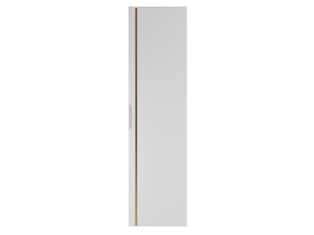 Vysoká skrinka do kúpeľne Espero 03 – biela spája minimalistický dizajn s praktickým riešením úložného priestoru. Je jediným vysokým modelom v kolekcii Espero, ktorá sa vyznačuje hladkým matným povrchom doplneným o zlatý pás. Dvierka sa otvárajú pomocou zafrézovaných úchytov, vďaka čomu skrinka pôsobí elegantne a ucelene.