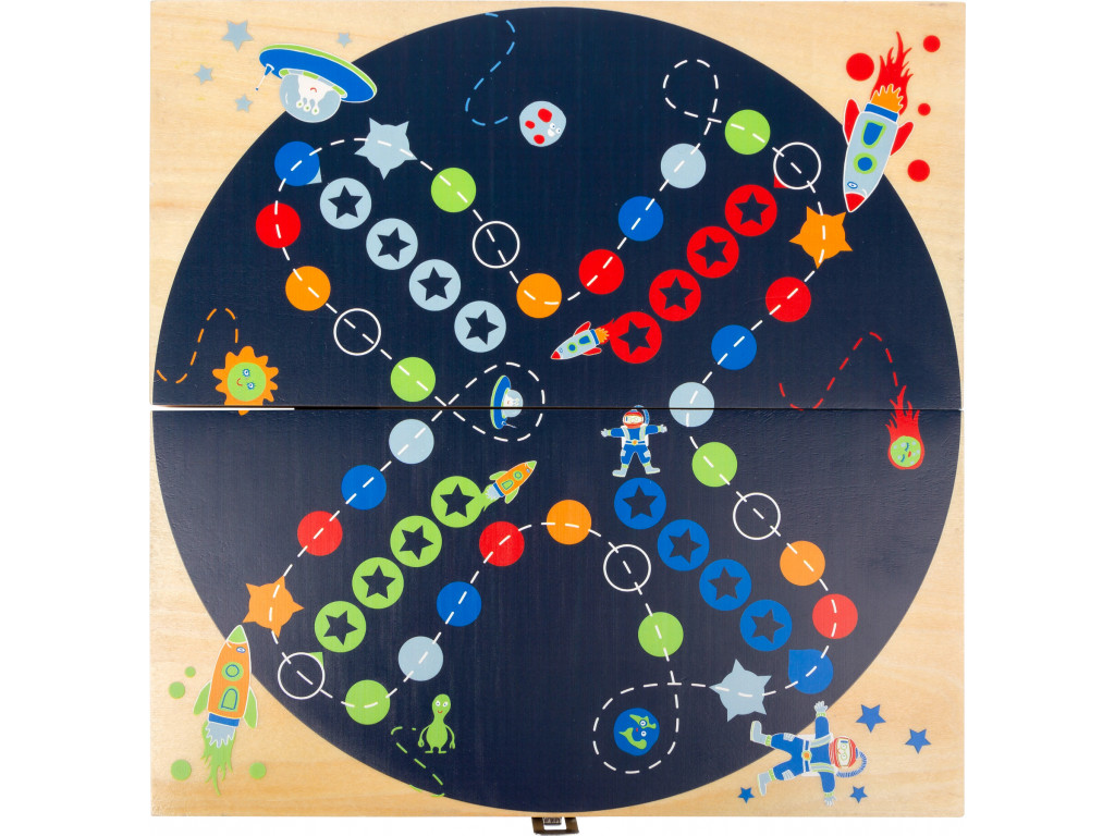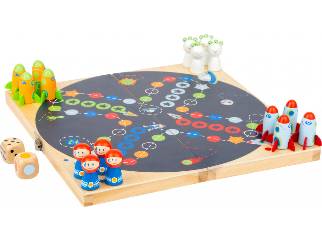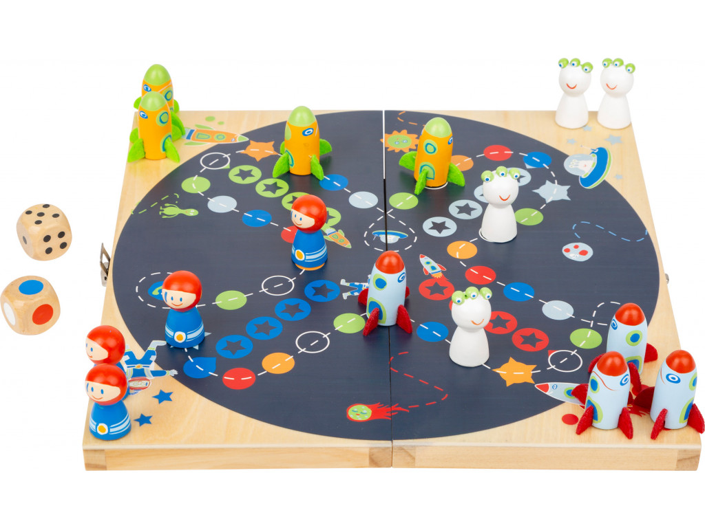 Vesmír na hernej doske! S touto hrou „Človeče, nehnevaj sa!“ sa splnia sny všetkých malých astronautov. Poletujú tu rakety, mimozemšťania, ktorí sa snažia dostať späť do domčeka. Klasická hra Človeče, ktorá má krásny dizajn a 2 typy kociek, takže je vhodná aj pre deti, ktoré ešte nevedia počítať. Kto ako prvý dostane svoje figúrky do domčeka - pole s hviezdami - vyhráva. Herná doska má zámok a tak je vhodná aj na cesty.