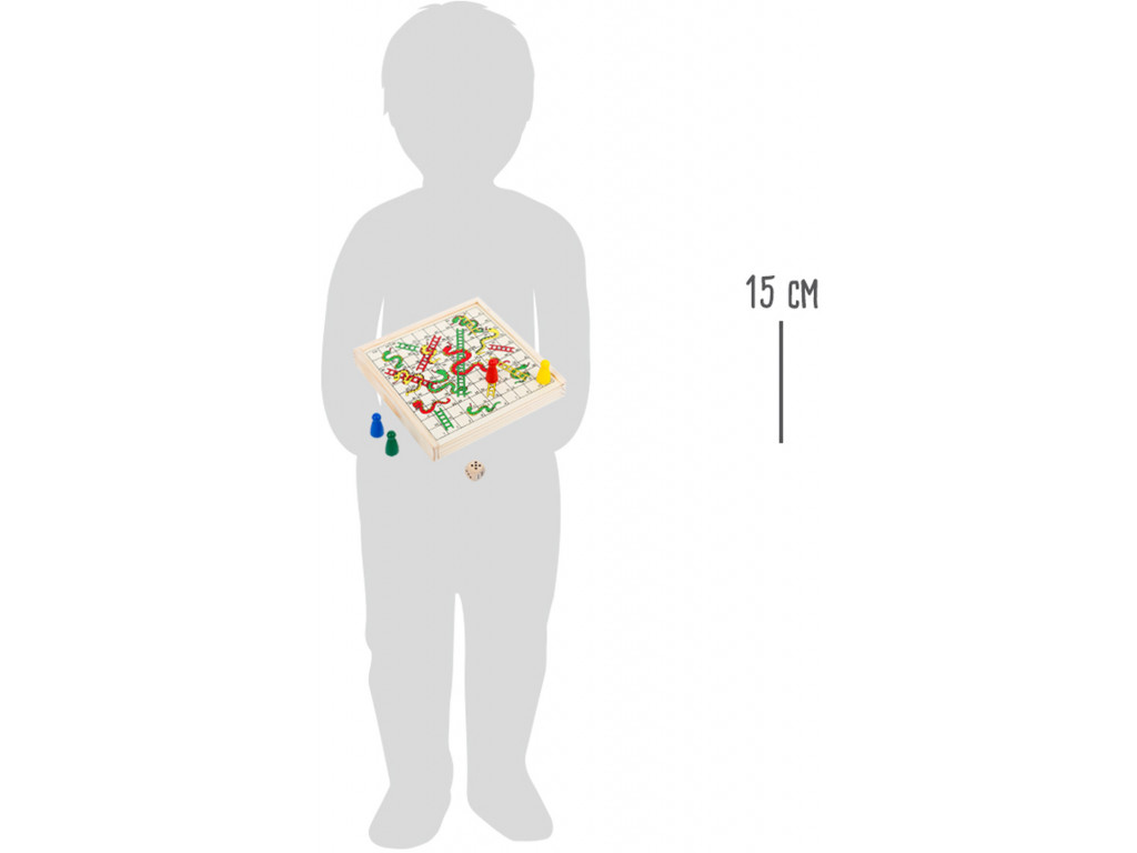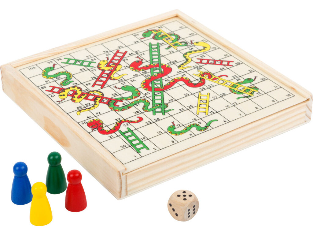 Štyria hráči, kocka a hracia doska s hadmi a rebríkmi. Kto sa dostane z políčka 1 na 100 najrýchlejšie? Táto kompaktná dosková hra je vyrobená zo 100 % FSC® dreva. Podľa toho, či sa postavíte na políčko hada alebo rebríka, vaša cesta do cieľa sa predĺži alebo skráti. Rebrík vás posúva vždy nahor, po slizkých hadíkoch sa však skĺznete dolu. Drobci tak majú príležitosť precvičiť svoje športové správanie a trpezlivosť. Táto stolná hra je perfektná aj na cesty. Dieliky sú bezpečne uložené vnútri drevenej škatule, ktorá zároveň slúži ako hracia doska.