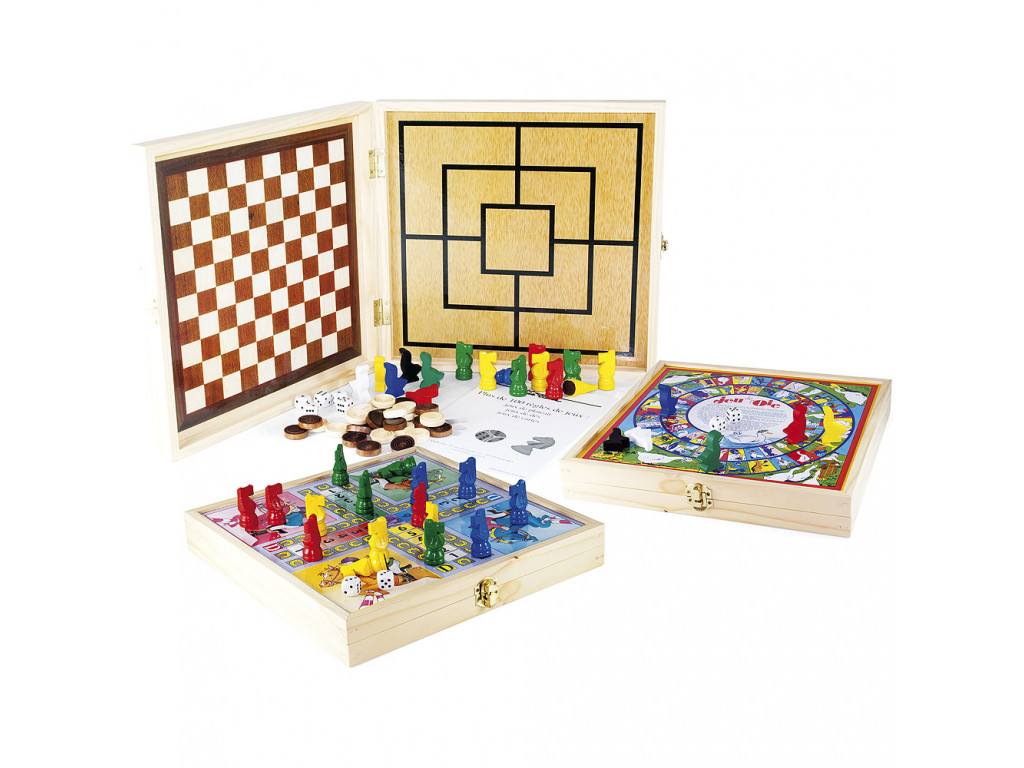 Súbor doskových a kartových hier v ucelenom praktickom balení. Nájdete tu dámu, mlyn, variant Človeče, nehnevaj sa s figúrkami koní, husí a súbor obsahuje tiež balíček bridžových kariet. Príslušenstvo k hrám je spoločne s pravidlami balené v drevenom boxe, ktorého plochy zároveň slúžia ako herné dosky.