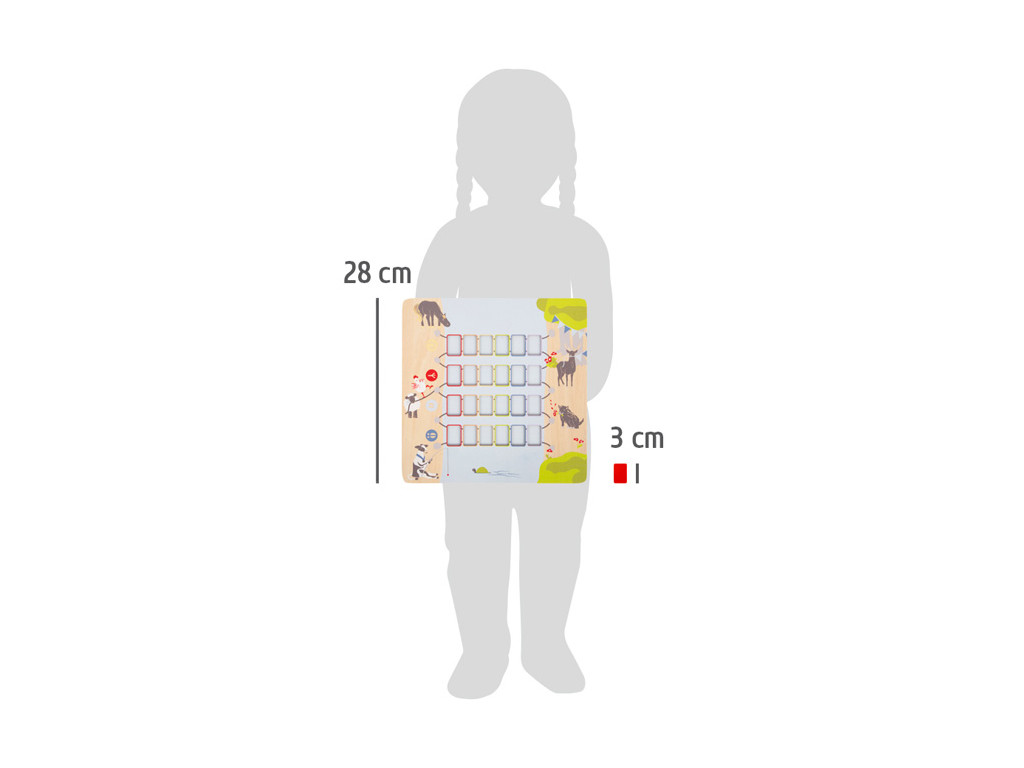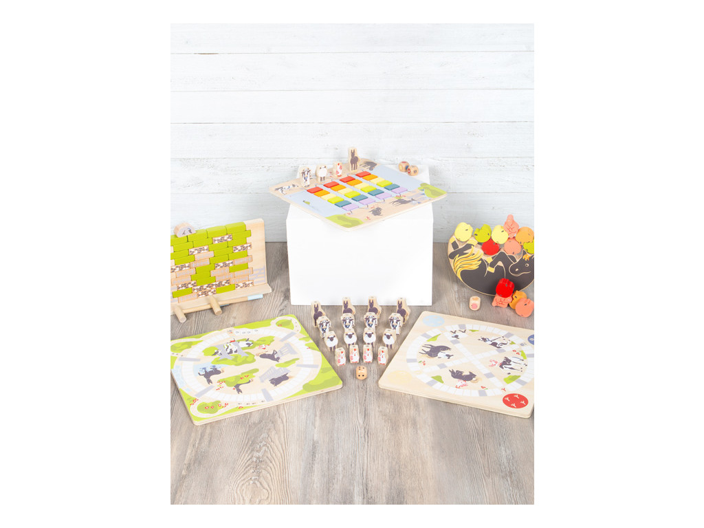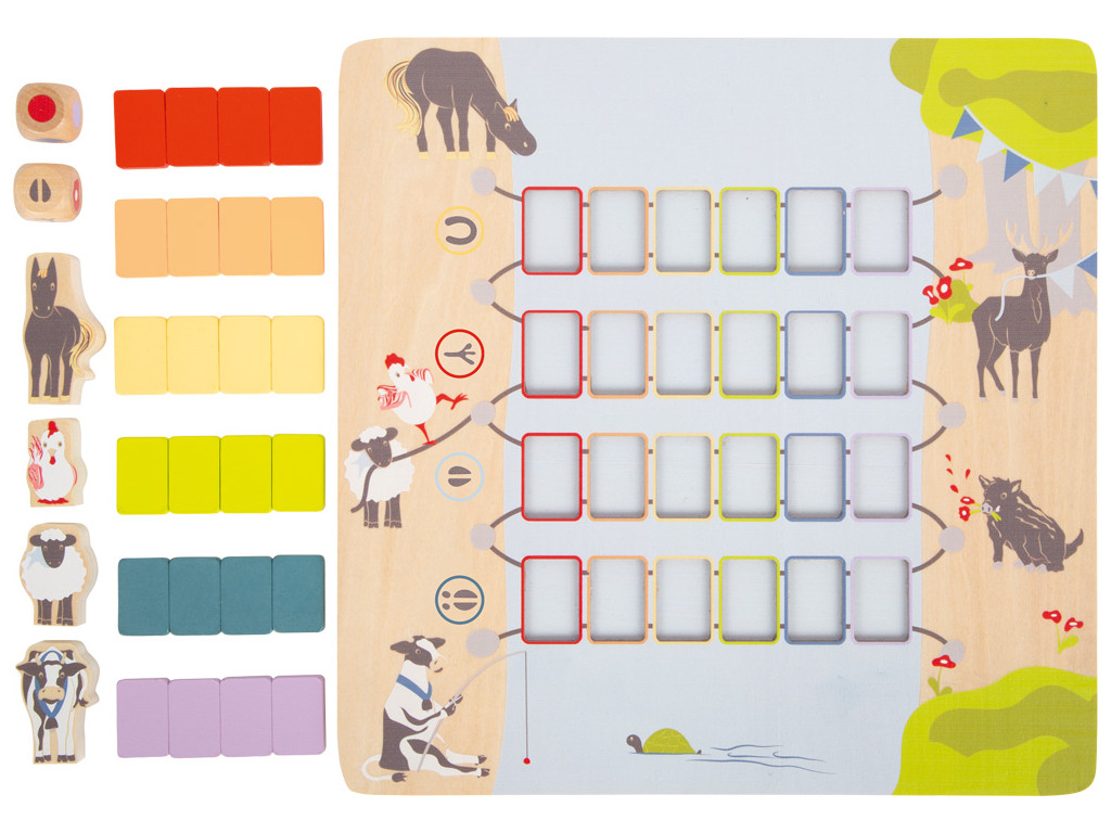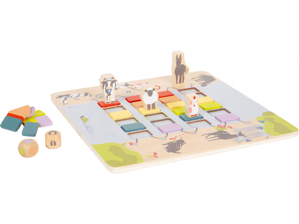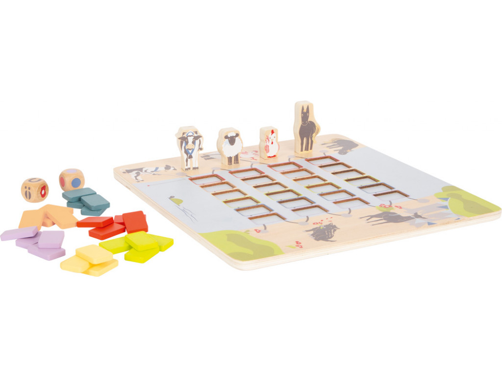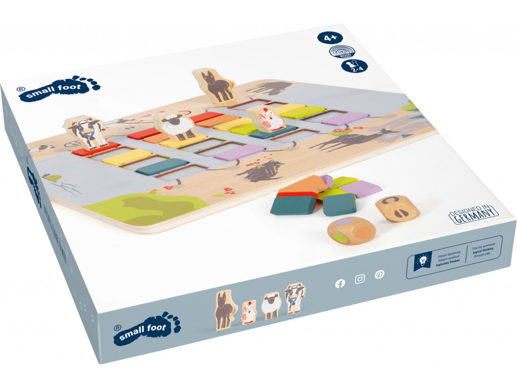 Drevená hra pre celú rodinu, ale špeciálne pre deti! Tri varianty hry bez počítania sú vhodné aj pre mladších hráčov. V balení nájdete farebnú kocku a kocku so stopami zvierat, deti sa tak naučia niečo nové. Dizajn v tematike "zvieratká na farme". Vysoko kvalitná hmatová hračka s jasne viditeľným drevom, trénuje motoriku. Uložené v kvalitnom a odolnom boxe. Hodí sa k ďalším hrám z radu "4 Friends". Môžete sa hrať samostatne alebo v skupine.