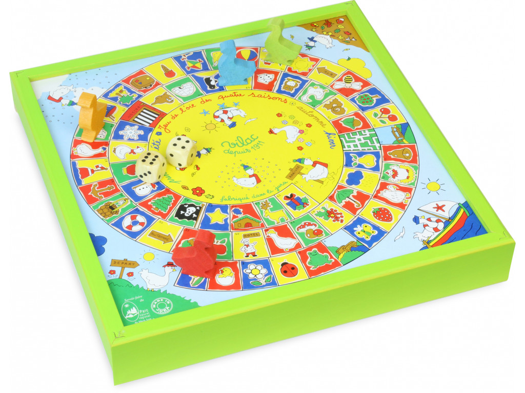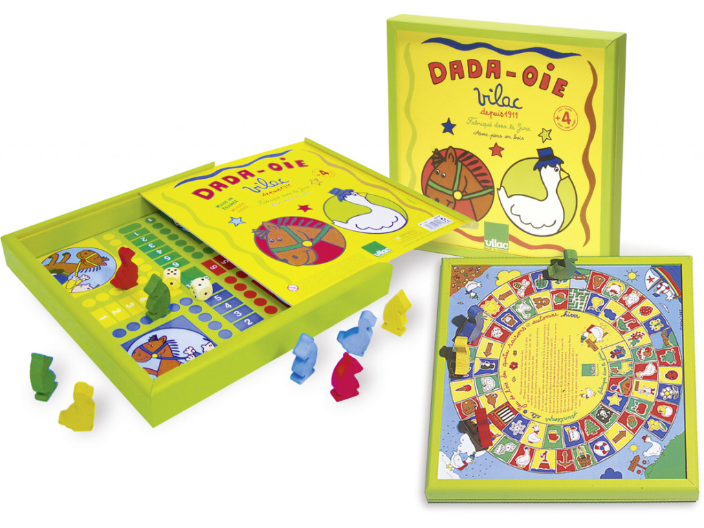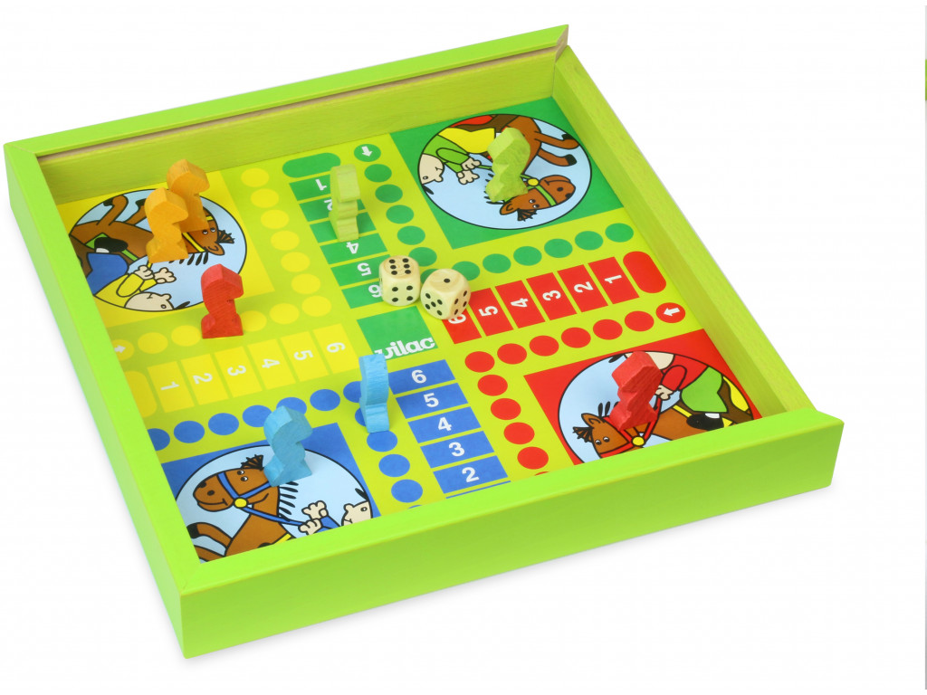 Klasický drevený súbor hier. Na jednej strane nájdete Človeče nehnevaj sa s figúrkami koní, na druhej Husaciu hru. Husacie hra spočíva v tom, že sa dvaja alebo traja hráči pohybujú po špirálovitom hracom poli a snažia sa vyhnúť políčkam s nástrahami ako napríklad "most" alebo "hotel". Zábavné hry pre malých i veľkých. Vyrobené vo Francúzsku.