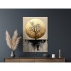 Strom života Zlaté ticho je holý strom pred zlatým kruhom pripomínajúci spojenie svetla a energie so symbolikou života a rovnováhy. Stekajúca čierno-biela textúra v spodnej časti pôsobí ako odraz alebo korene, ktoré zanikajú v hĺbke. Tento obraz prinesie pokoj a symbolickú hĺbku do každého moderného priestoru.
