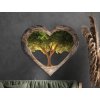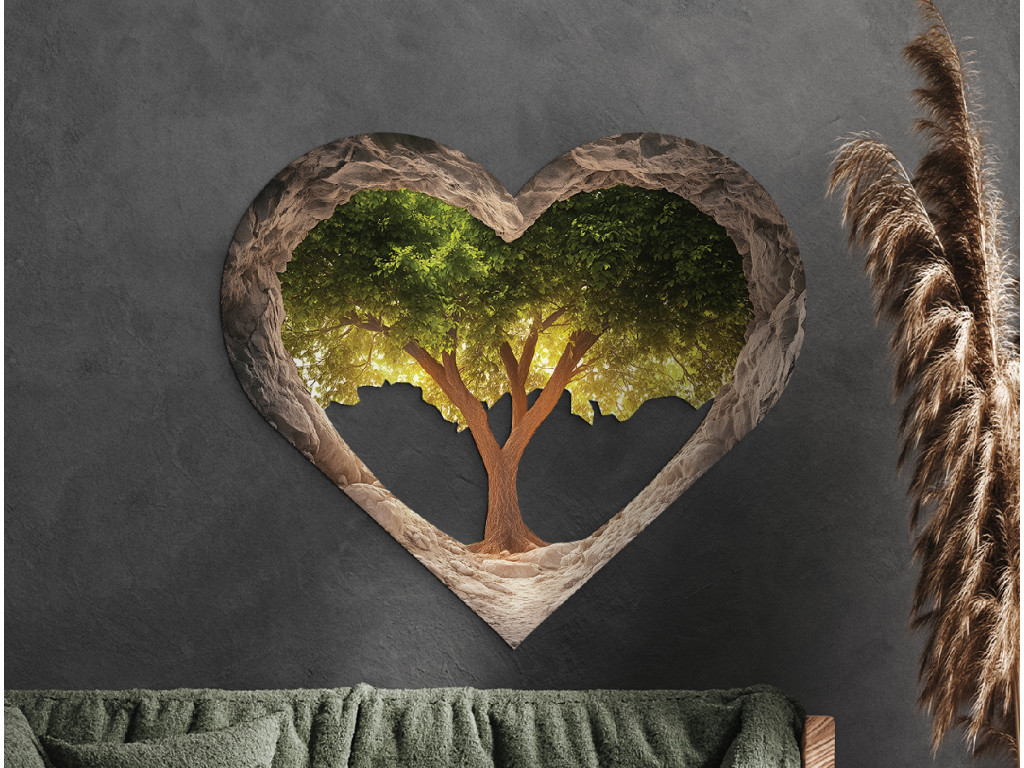Obraz zachytáva strom s bohatou zelenou korunou vyrastajúci v srdcovitom priestore pripomínajúcom jaskyňu alebo skalný útvar. Textúrované okraje srdca evokujú hĺbku a ochranu, zatiaľ čo prenikajúce svetlo zozadu vytvára pocit nádeje a pokoja. Dielo symbolizuje život, rast a silu ukrytú v srdci prírody.