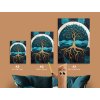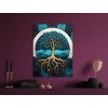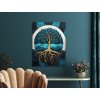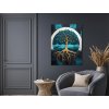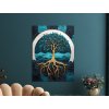 Výrazné korene a zlatistá koruna stromu vytvárajú silný symbol prepojenia medzi nebom a zemou. Tyrkysovo-modré pozadie s jemnými oblúkmi navodzuje pocit pokoja a harmónie. Povrchová textúra a zlaté prvky dodávajú obrazu hĺbku, umeleckosť a prirodzenú energiu.