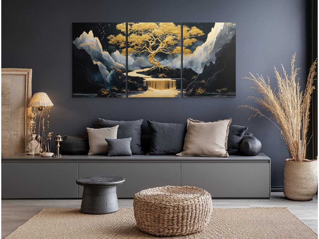 Zlatý strom v centre triptychu pôsobí ako harmonický stred prírody a energie. Pod ním padá zlatý vodopád, obklopený tmavými a svetlými horskými masívmi. Dramatický kontrast Stromu života a zlaté akcenty vytvárajú vizuálnu symfóniu pokoja a sily.