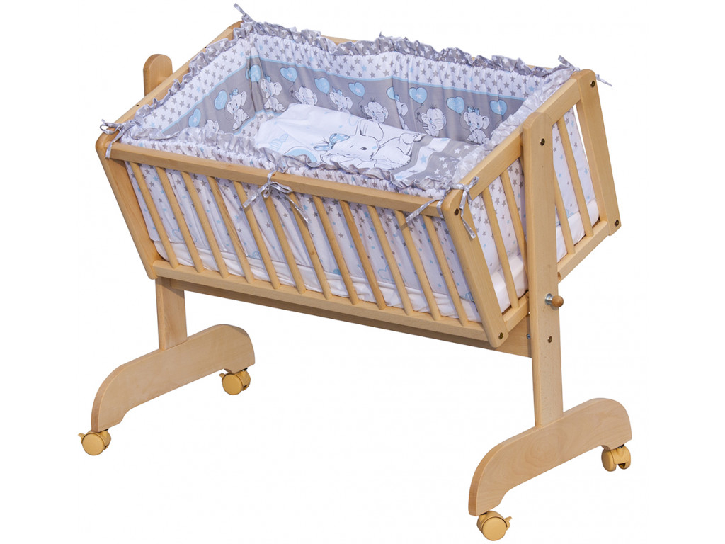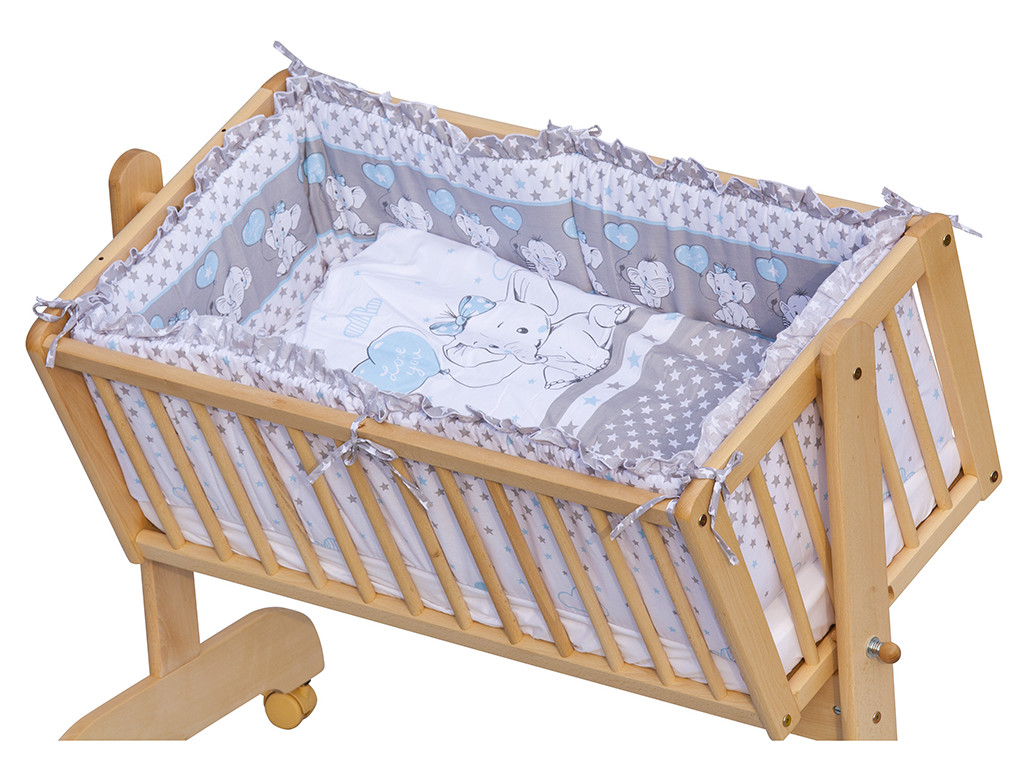 Detská súprava do kolísky poteší každú nastávajúcu mamičku. Bude skvelým doplnkom detskej kolísky, v ktorej sa bude páčiť všetkým deťom. Šesťdielna súprava okrem vankúša a perinky obsahuje bavlnené detské obliečky s pekným motívom sloníka v modrej farbe a detskú plachtu. Ochranu dieťaťa pred neželaným prievanom či úrazom zabezpečí praktický mantinel, ktorý sa zaväzuje na mašličky o rám kolísky.