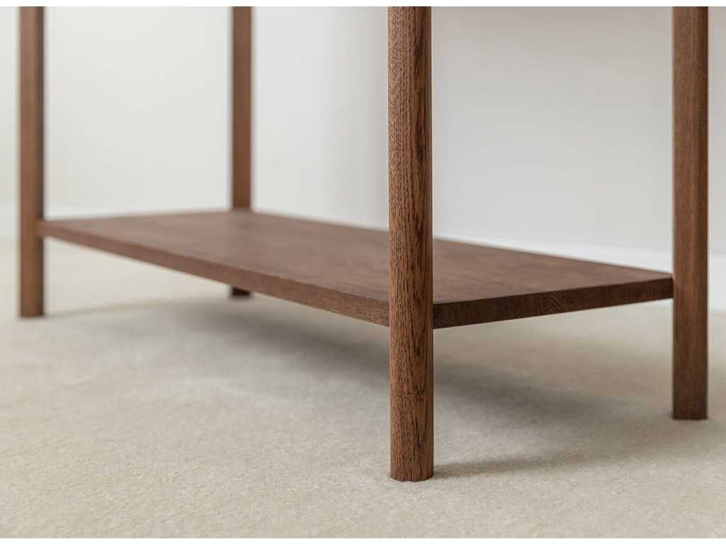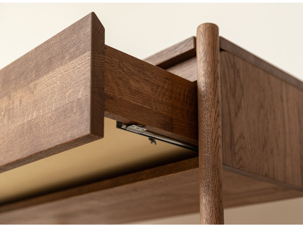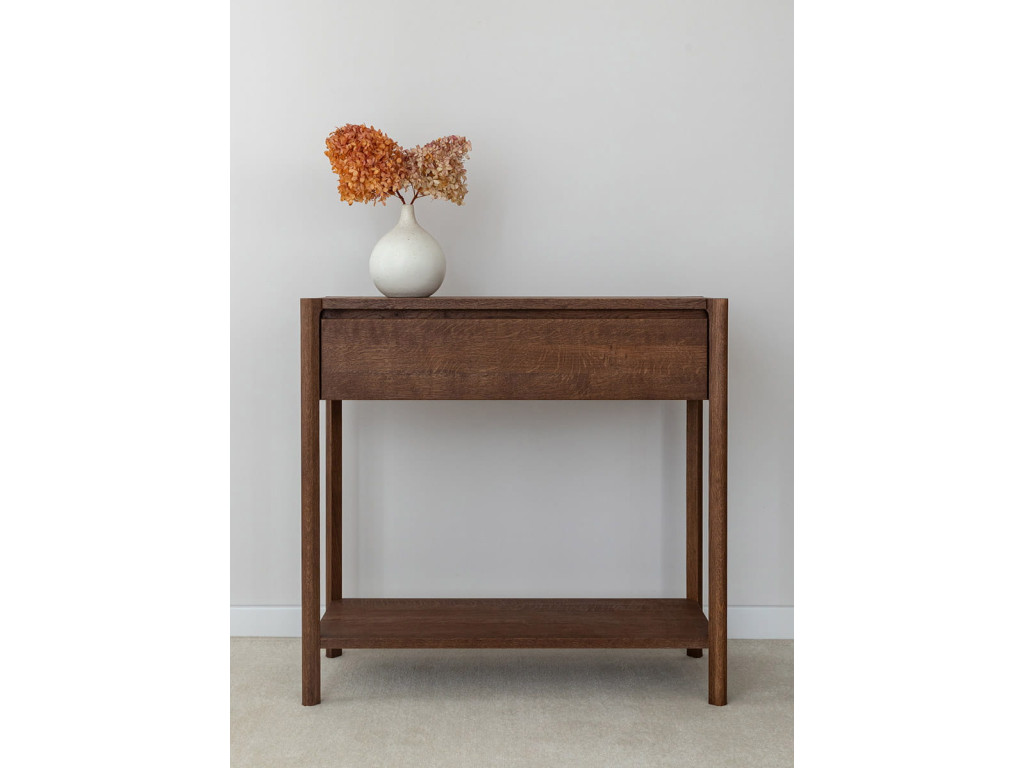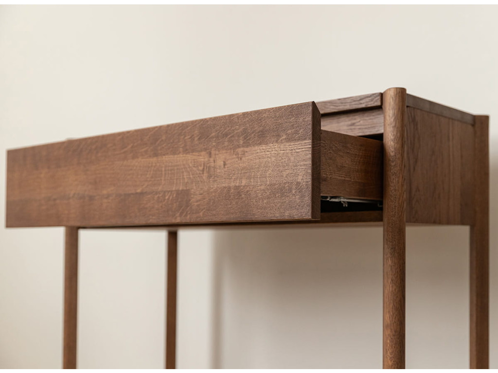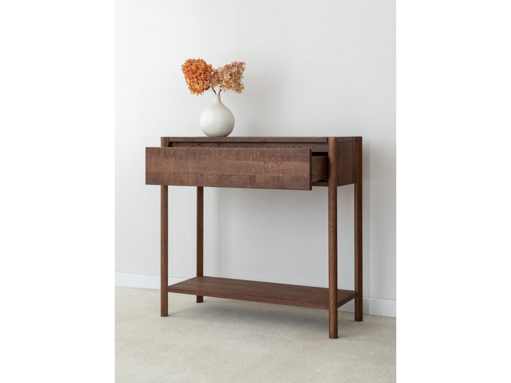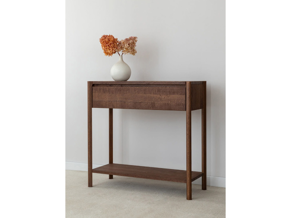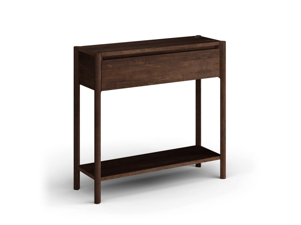 Konzolový stolík Campi v prevedení tabakovo hnedá prináša do priestoru teplejší, výraznejší charakter pri zachovaní minimalistickej estetiky. Masívne dubové drevo v kombinácii s olejovanou povrchovou úpravou vytvára odolný a vizuálne príťažlivý povrch s dôrazom na prirodzenú štruktúru. Stolík disponuje zásuvkou s tlmeným dovieraním a praktickou otvorenou policou, ktorá rozširuje jeho využitie. Skvele sa hodí do vstupných priestorov aj obytných miestností, kde ponúka funkčnosť bez zbytočnej robustnosti.