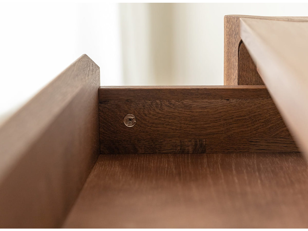 Celá séria je vyrobená z kvalitného dubového masívu, ktorý vyniká dlhou životnosťou. Konečná úprava olejovaním v polomatnom prevedení zvýrazňuje prirodzenú kresbu dreva, chráni povrch a zachováva jeho autentický charakter. Kolekcia je dostupná v dvoch farebných variantoch – prírodný dub a tabakovo hnedá.