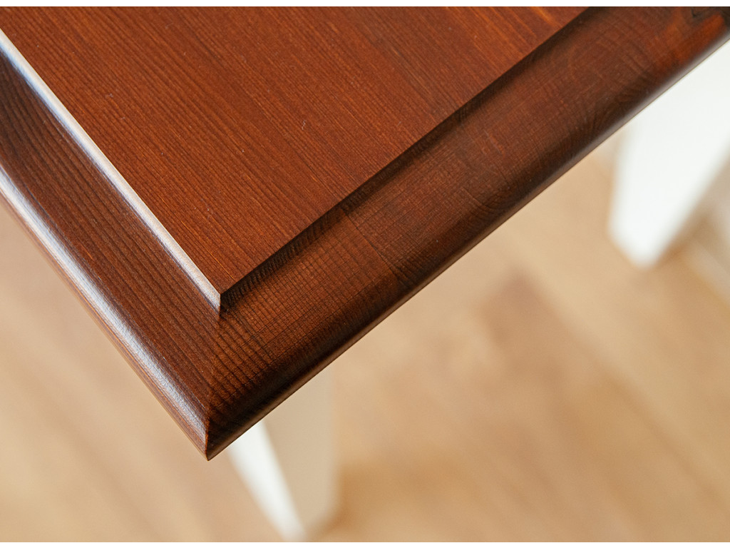 Toaletný stolík Bellu z borovice bol vyrobený z masívu najvyššej kvality. Prírodný materiál fínskej borovice je zárukou trvanlivosti a odolnosti voči poškodeniu. Biely drevený toaletný stolík je natretý ekologickou farbou na vodnej báze v odtieni krémovej, teplej bielej farby. Táto farba dodáva interiéru útulnosť. Nábytok vyzerá skvele oproti pastelovým aj kontrastnejším stenám. Vrchná doska je vo farbe orech.