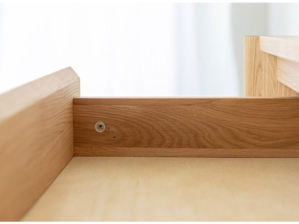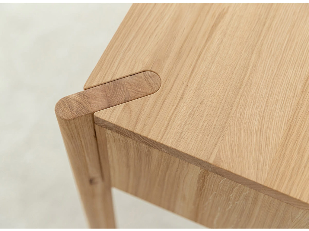 Celá séria je vyrobená z kvalitného dubového masívu, ktorý vyniká dlhou životnosťou. Konečná úprava olejovaním v polomatnom prevedení zvýrazňuje prirodzenú kresbu dreva, chráni povrch a zachováva jeho autentický charakter. Kolekcia je dostupná v dvoch farebných variantoch – prírodný dub a tabakovo hnedá.