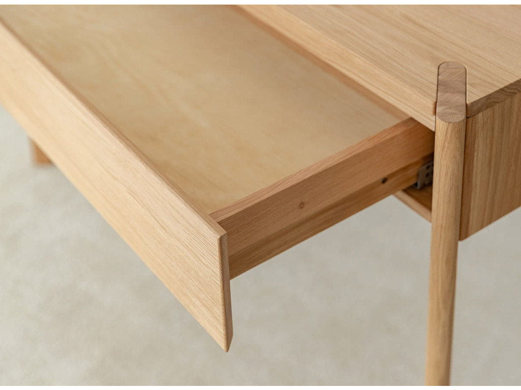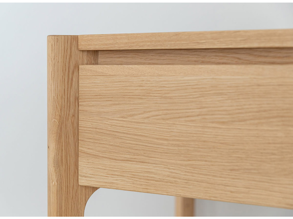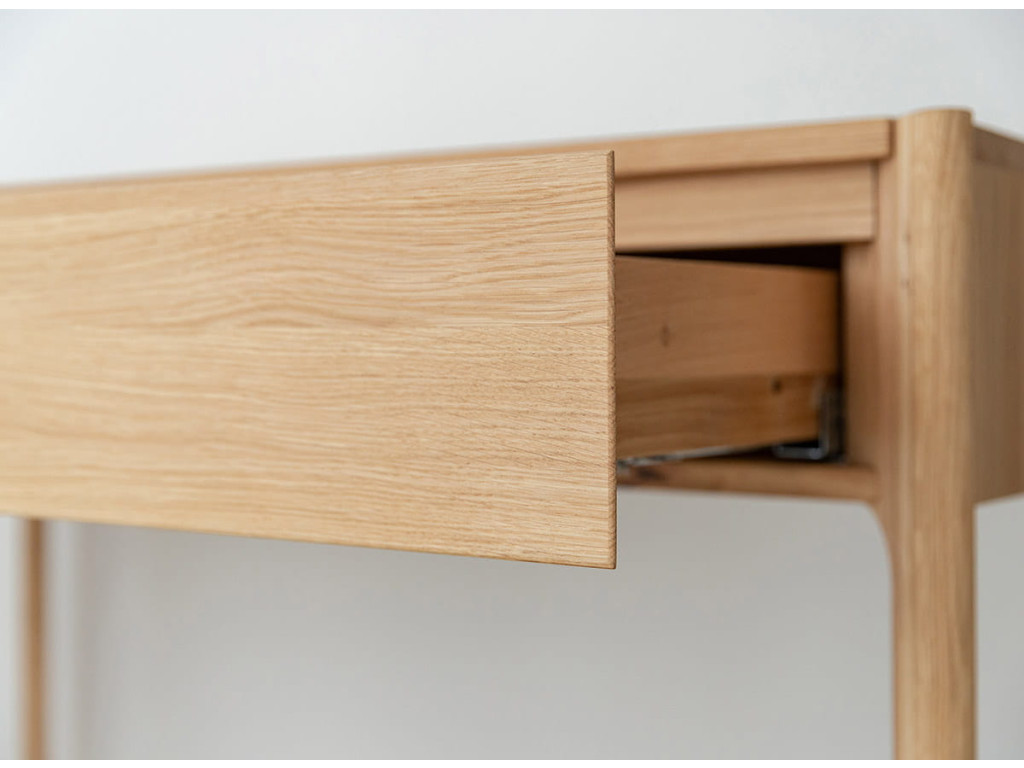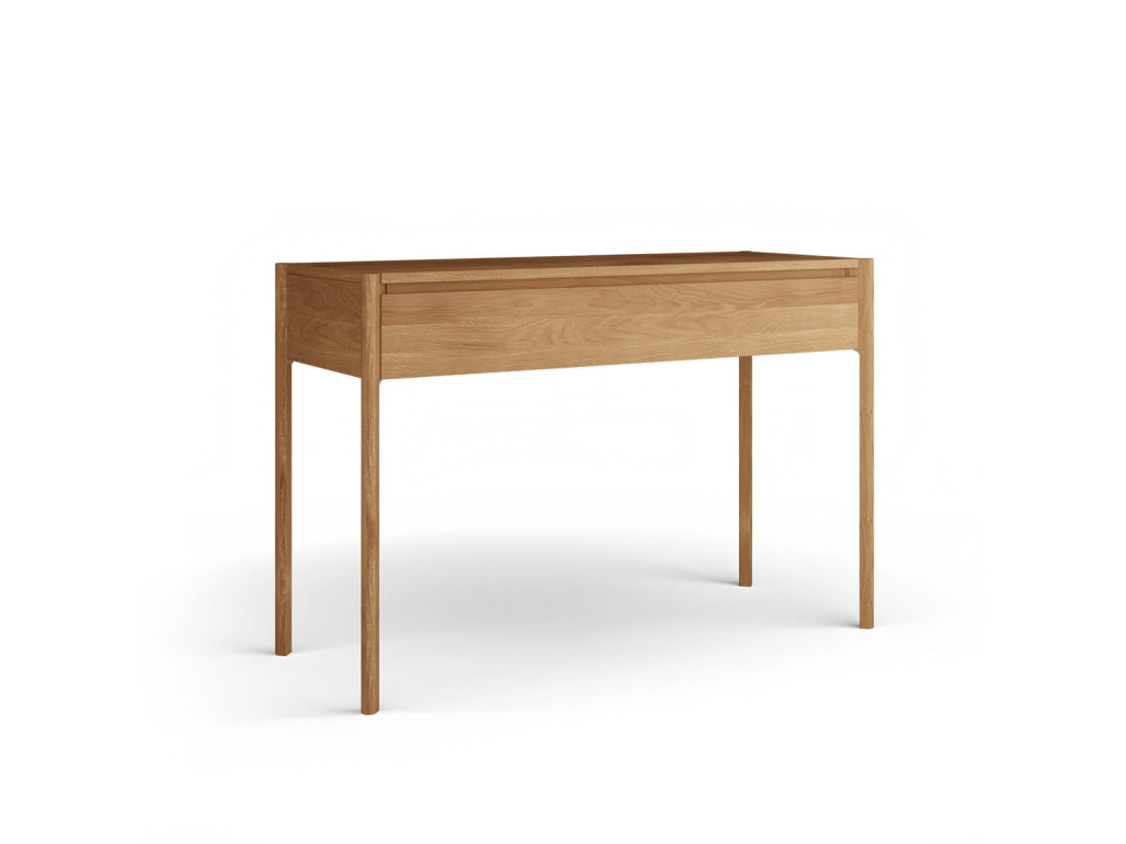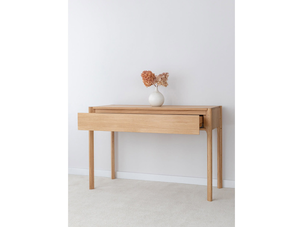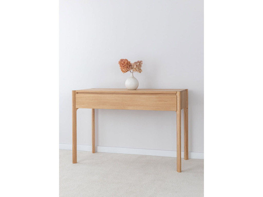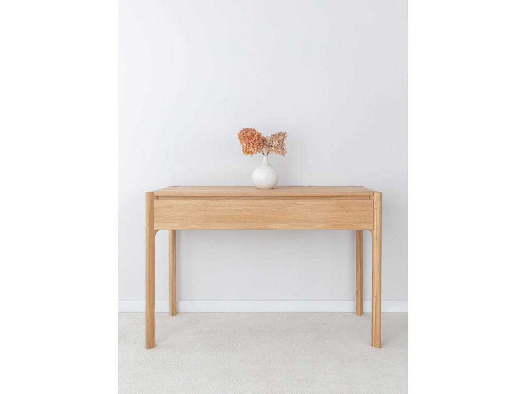 Toaletný stolík Campi z masívneho dubu vytvára ideálny priestor pre každodenné rituály. Jeho jednoduchý dizajn pôsobí pokojne a prirodzene. Praktická zásuvka pomáha udržať poriadok a organizáciu. Skvelá voľba pre interiér, kde sa spája funkčnosť a jemná elegancia.