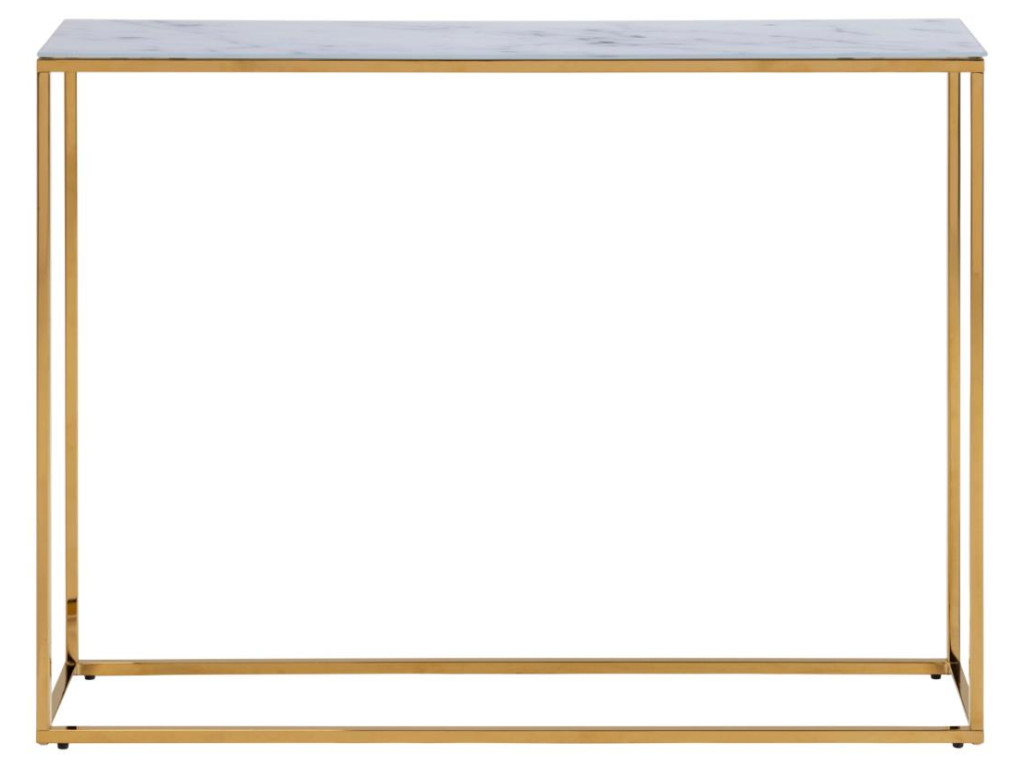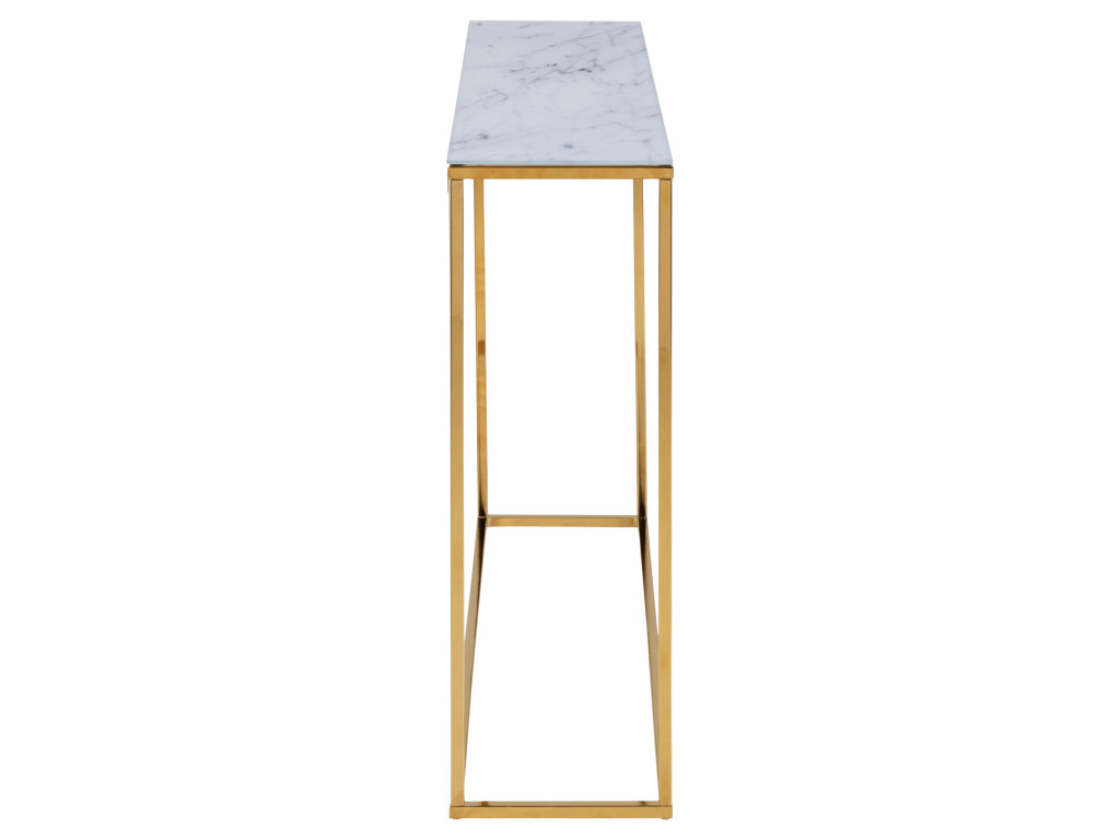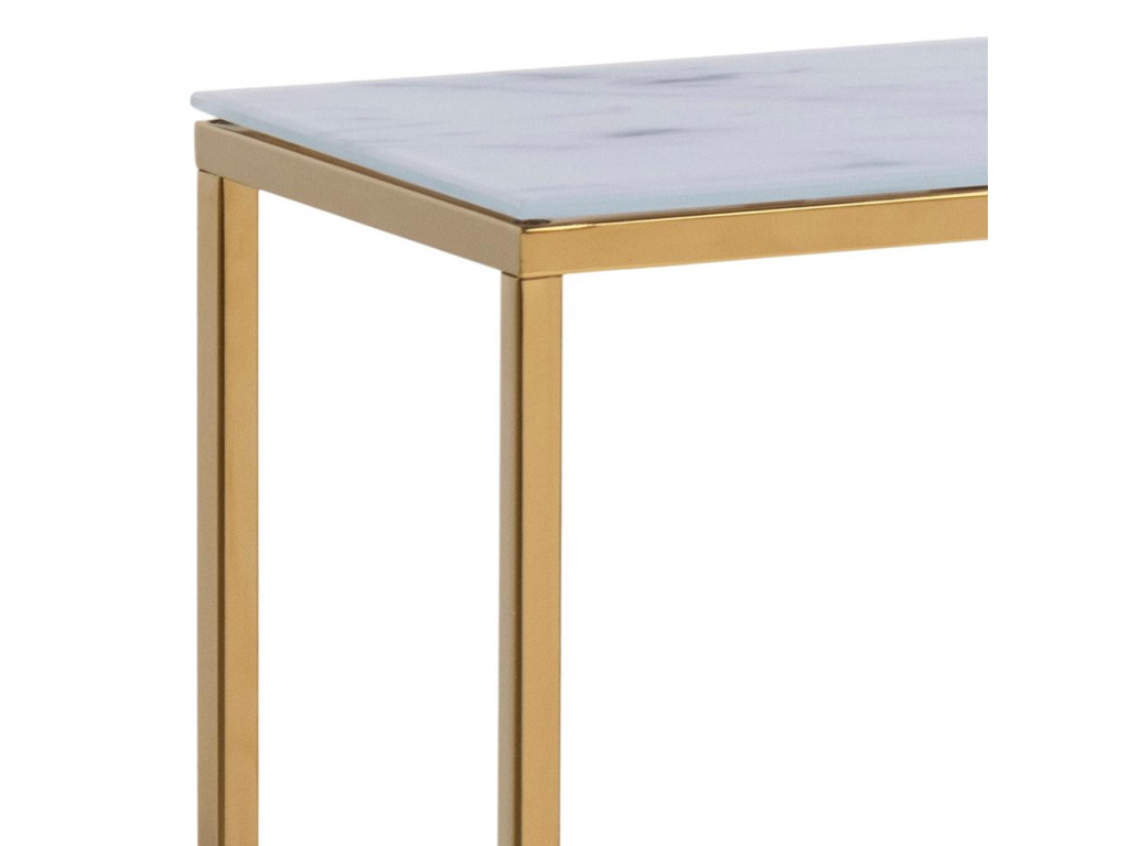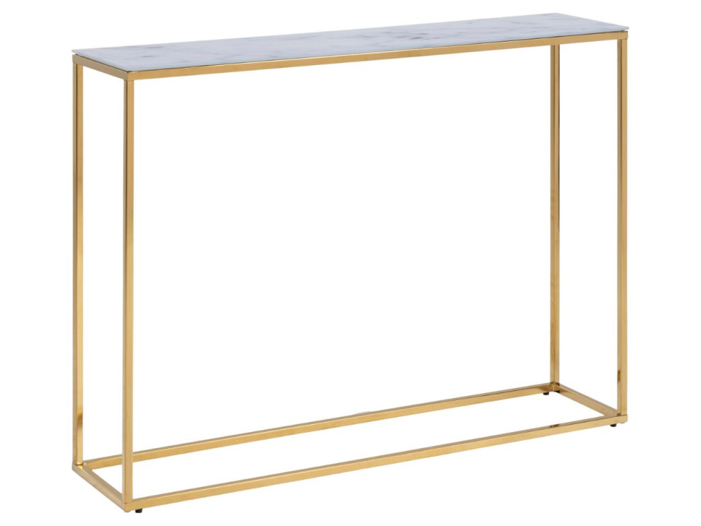 Alisma rectangular console table, top white crystal clear marble Rome tempered and frosted glass, base gold chrome steel, 110x26x80.5 cm