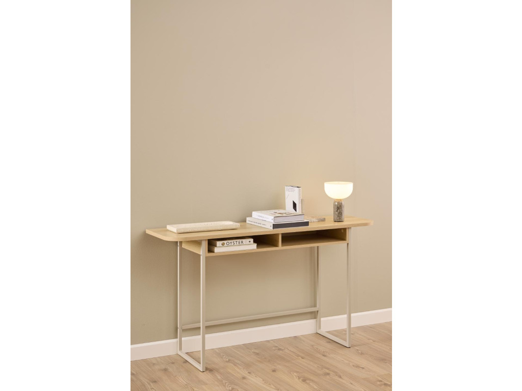 Vrchná doska v dubovom vzhľade je ľahko udržiavateľná, odolná a príjemne teplá na pohľad. Robustná kovová základňa v tvare saní s hrubým sivým práškovým nástrekom zaručuje stabilitu aj štýlový kontrast. Dve otvorené priehradky poskytujú miesto pre odkladanie dekorácií, kníh alebo drobností, ktoré chcete mať po ruke.
