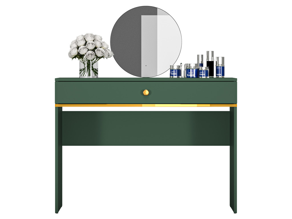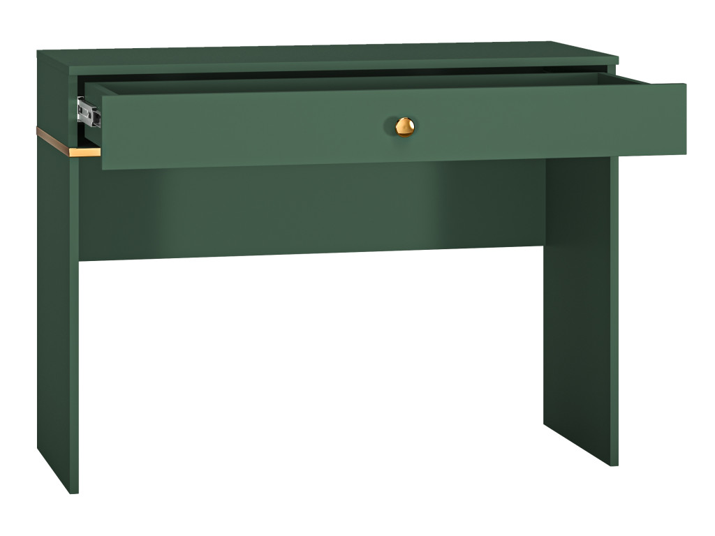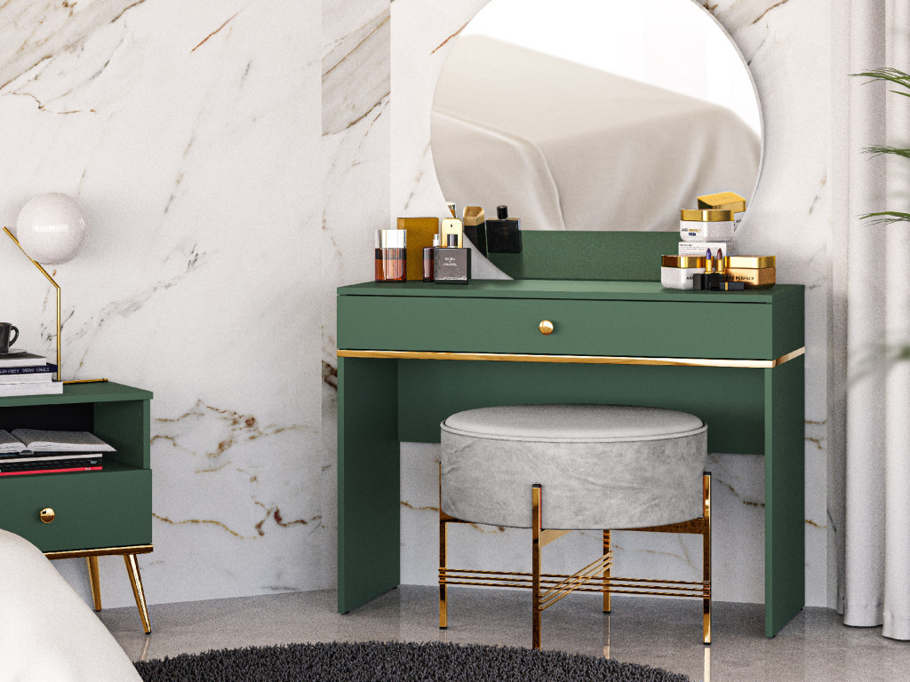 Toaletný stolík Flora 09 v elegantnom tmavozelenom odtieni prináša do spálne štýlový priestor na kozmetiku a doplnky. Priestranná doska je ideálna na vystavenie obľúbených dekorácií, zatiaľ čo zásuvka so zlatou úchytkou pridáva luxusný detail a praktický úložný priestor.