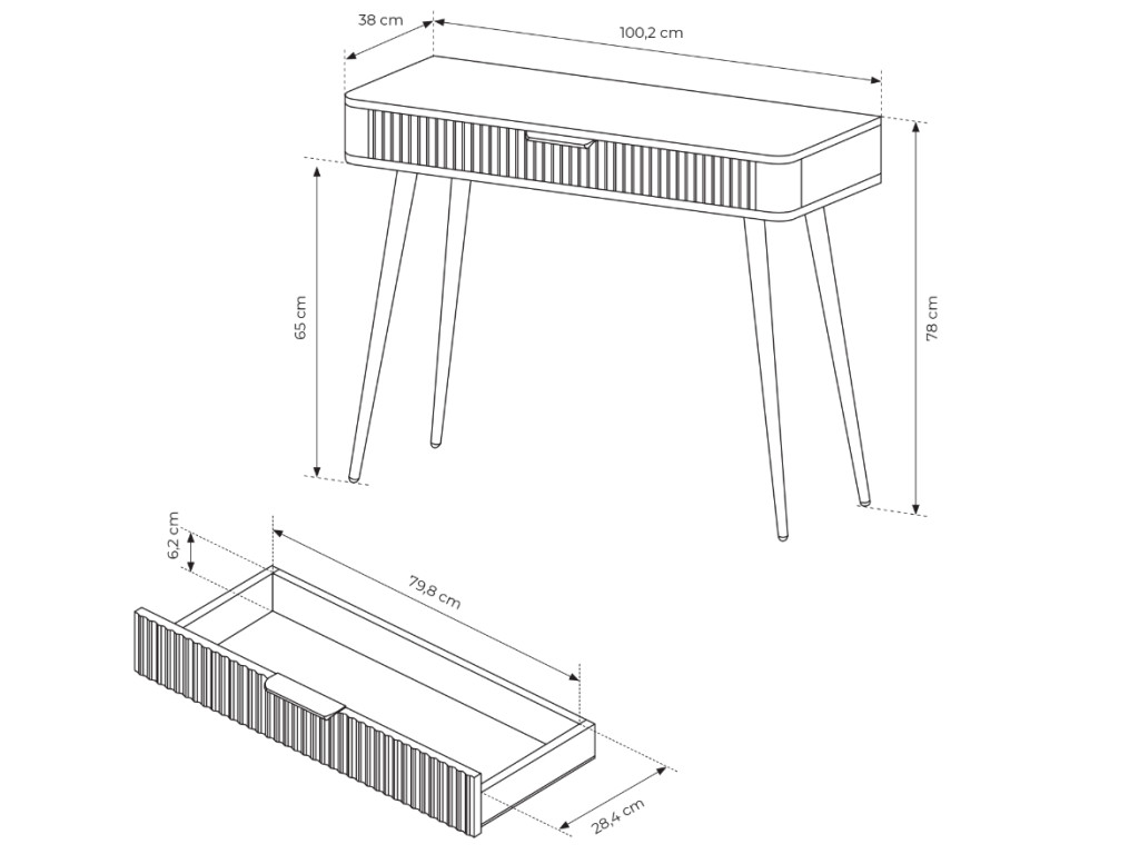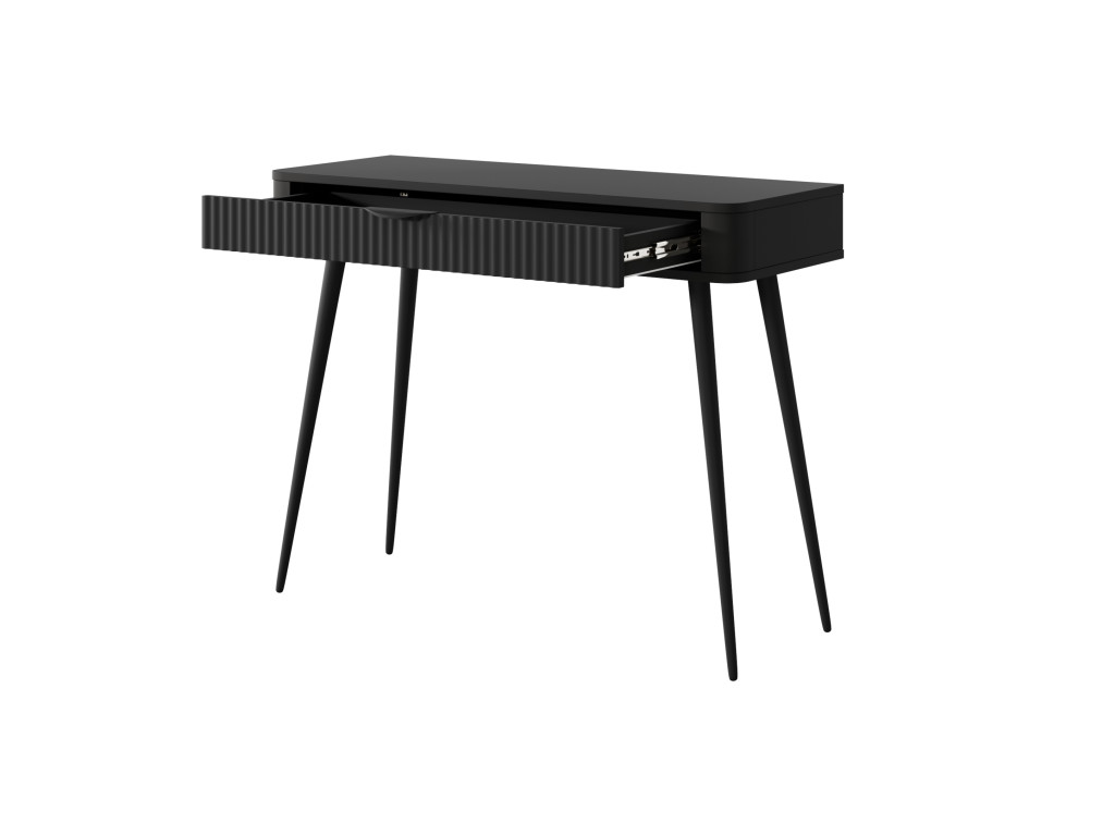 Noblesný toaletný stolík Lante ponúka praktický úložný priestor v podobe zásuvky. Jeho sofistikovaný vzhľad zvýrazňujú vysoké čierne nožičky a úchytky. Zaujímavým prvkom je čierne farebné prevedenie s vrúbkovaným dizajnom na prednej strane zásuvky. Toaletný stolík tiež vyniká hladkými líniami bez ostrých hrán, čo prispieva k jeho bezpečnosti a dodáva mu jemnú eleganciu.