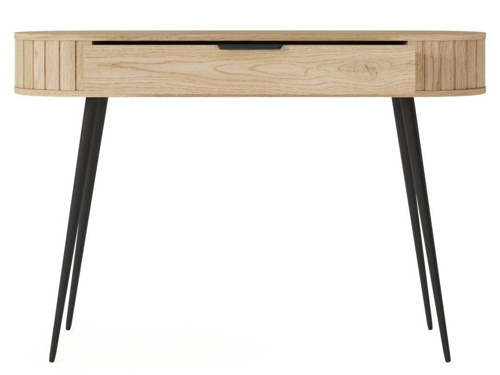 Toaletný stolík Lovi C – dub krémový spája jemnú eleganciu s praktickým dizajnom. Svetlý drevitý dekor, ryhované čelá a zaoblené línie vytvárajú harmonický doplnok moderného interiéru. Push-to-open zásuvka, kovové nohy a odolné ABS hrany zabezpečujú pohodlné používanie aj dlhú životnosť.
