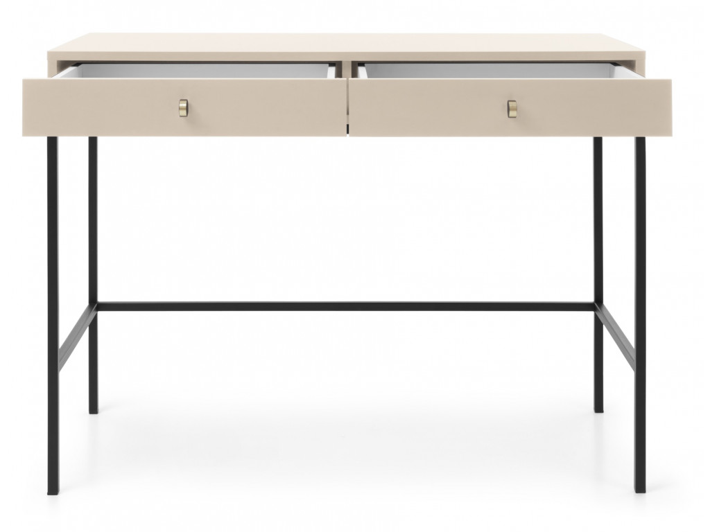 Nadčasový toaletný stolík z kolekcie Mono v béžovej farbe zaujme každého, kto sa zaujíma o moderný nábytok. Atraktívny dizajn zdôrazňujú zlaté úchytky a čierny kovový podstavec, vďaka ktorému nábytok pôsobí odľahčeným dojmom. Nohy zároveň umožňujú jednoduchú údržbu podlahy.
