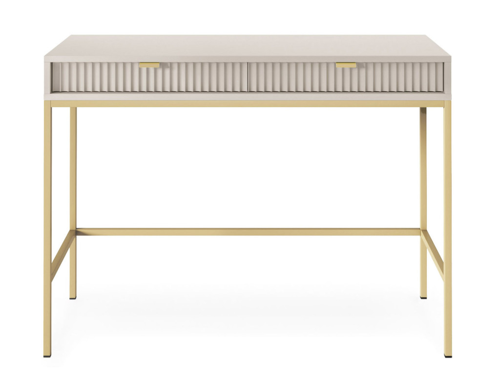 Moderný kozmetický stolík Novas v béžovej farbe s drážkovanými čelami, zlatými úchytkami a kovovým podstavcom poskytuje elegantný priestor na každodenné skrášlenie. Praktický, odolný a štýlový doplnok do spálne.