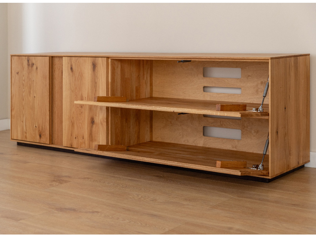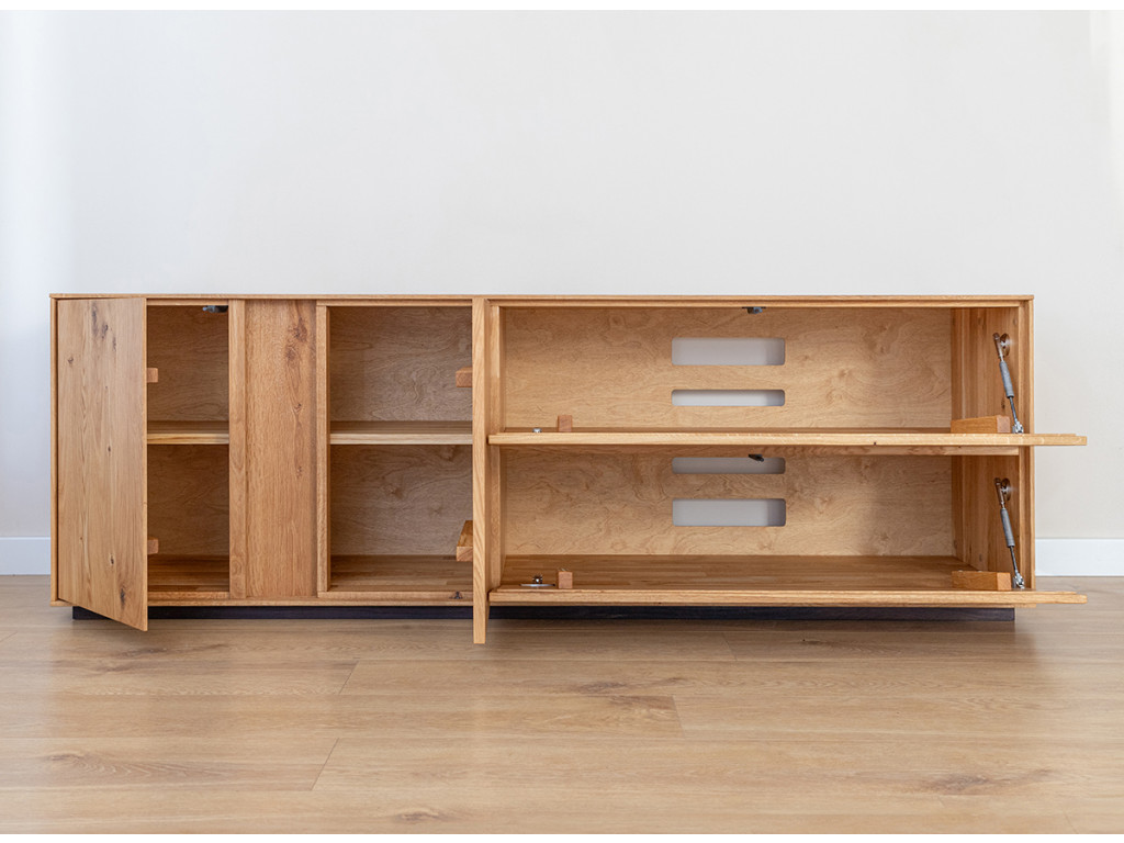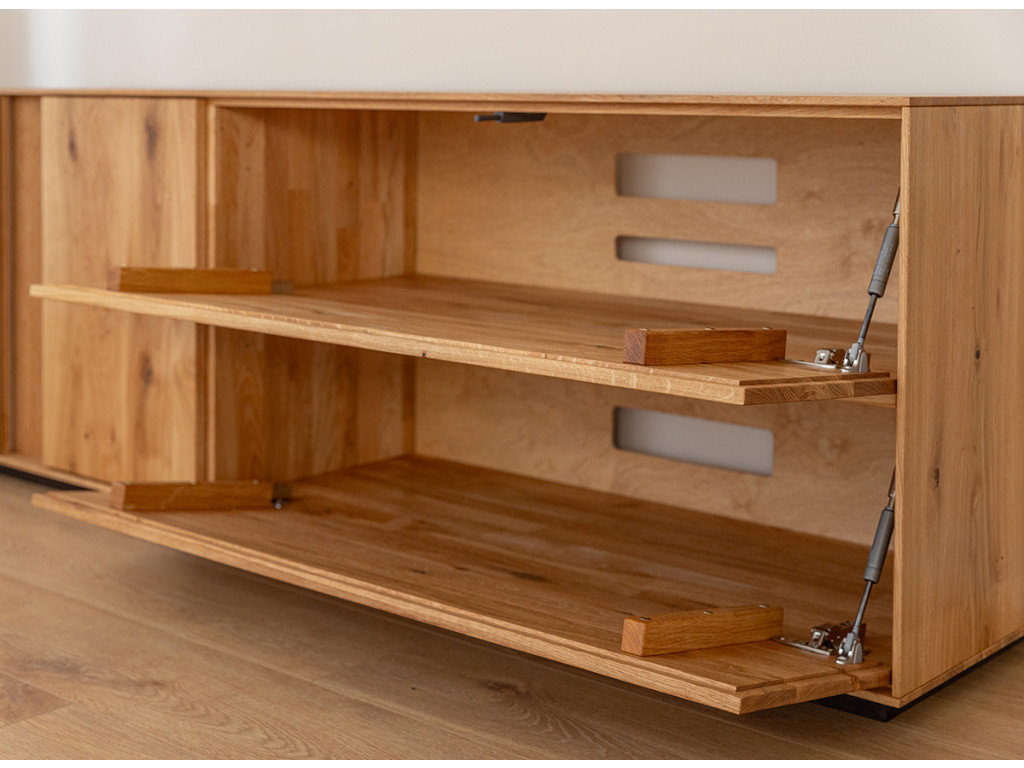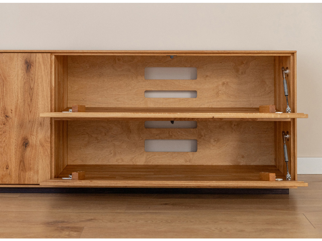 Drevený stolík pod TV sa skladá z dvoch skriniek s plnými dvierkami a z dvoch skriniek s výklopnými dvierkami. Skrinky sú navzájom predelené drevenou policou pre lepšiu organizáciu priestoru na odkladanie. Zadná stena skriniek s výklopnými dvierkami obsahuje výrezy na prestup káblov pre príslušenstvo. Univerzálny dizajn predurčuje televízny stolík z dreva do moderného, škandinávskeho alebo industriálneho interiéru.