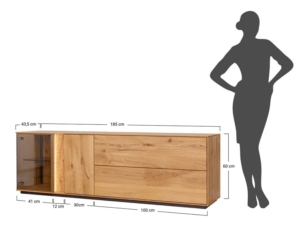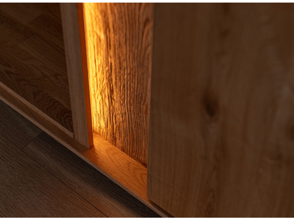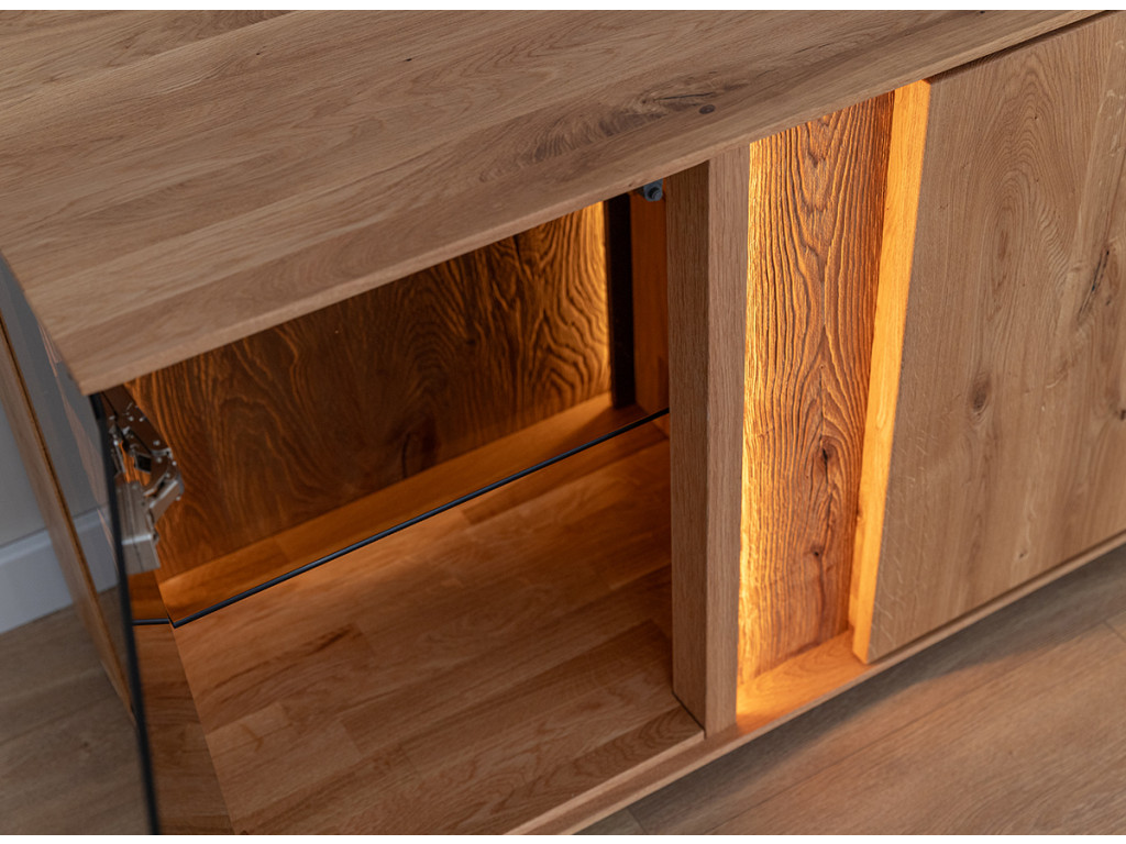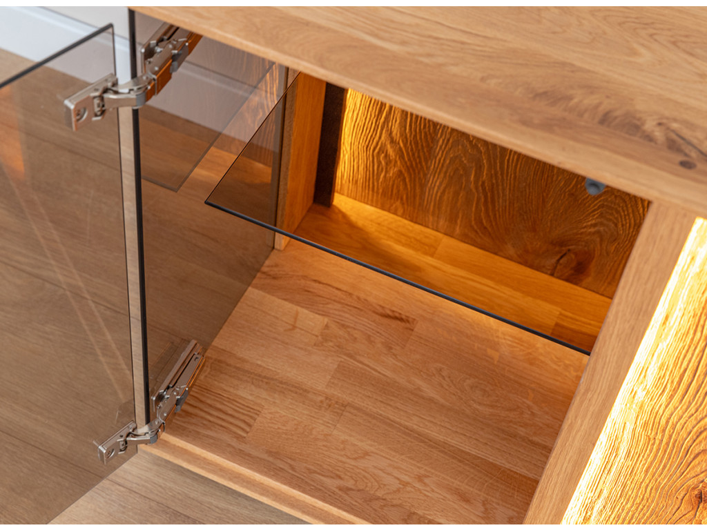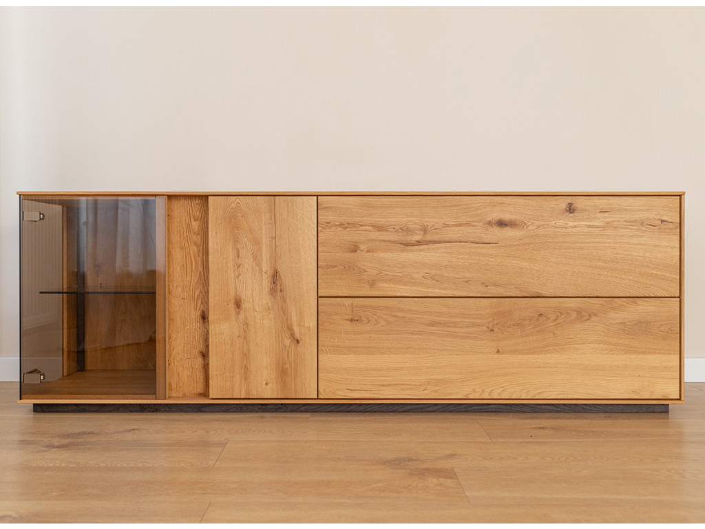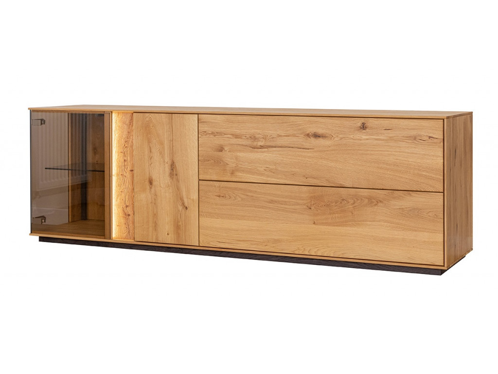 Drevený stolík pod TV z kolekcie Collodi je kombináciou elegancie a prírodnej krásy dubového masívu. Jeho teplý zlatý odtieň zaručene upúta pozornosť, zatiaľ čo viditeľná štruktúra a uzly podčiarkujú osobitosť a jedinečnosť každého kusu. Za dizajnom nijako nezaostáva ani samotné usporiadanie nábytku. Na jednej strane sa nachádzajú dve skrinky s výklopnými dvierkami, na druhej strane je uzamykateľná skrinka s policami a časť so skleným čelom a sklenou policou. Vďaka svojmu univerzálnemu dizajnu televízny stolík z dreva dokonale zapadne do moderného, škandinávskeho alebo industriálneho interiéru.