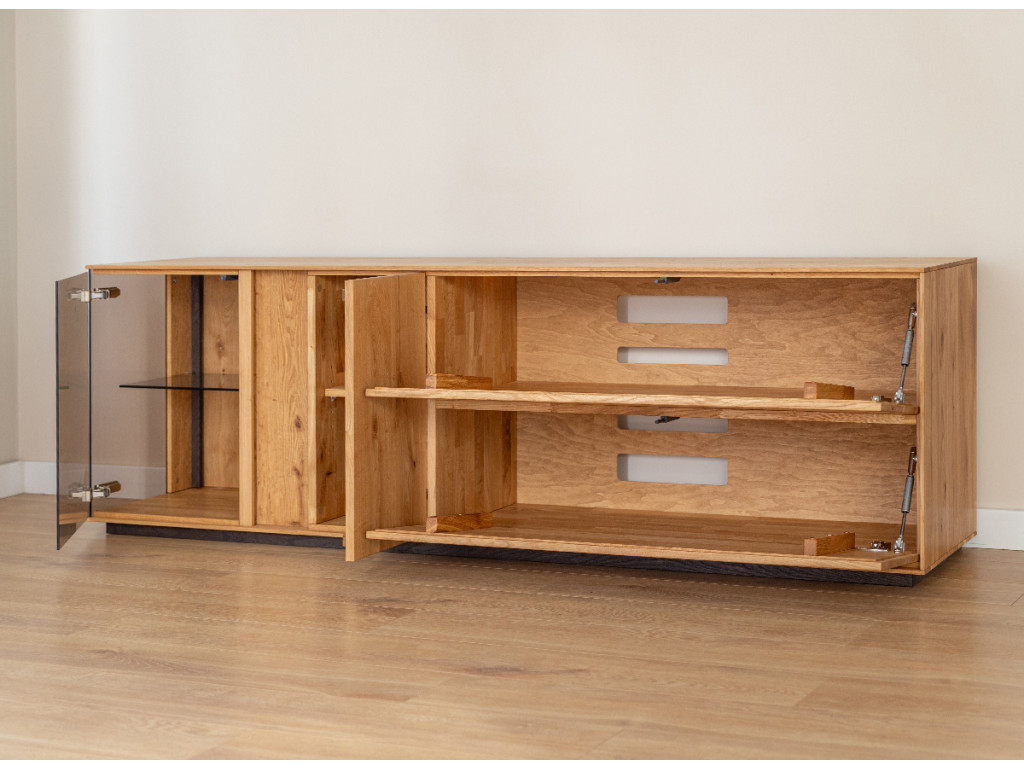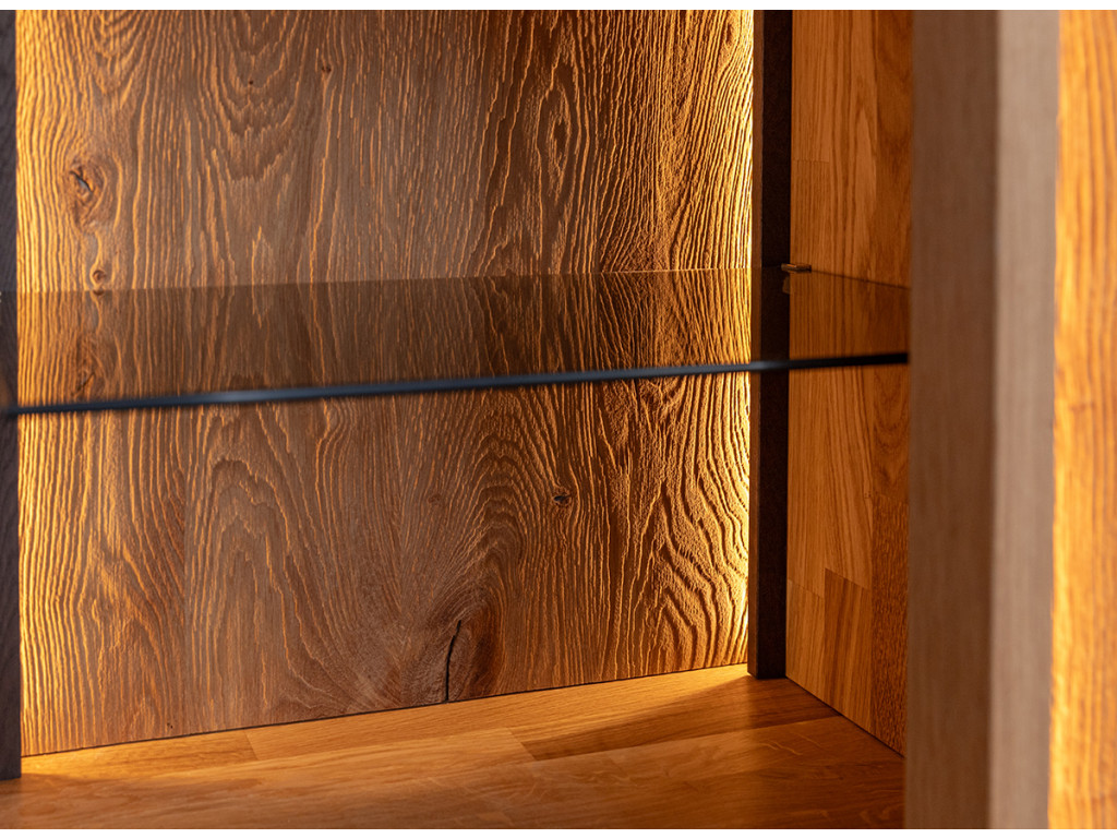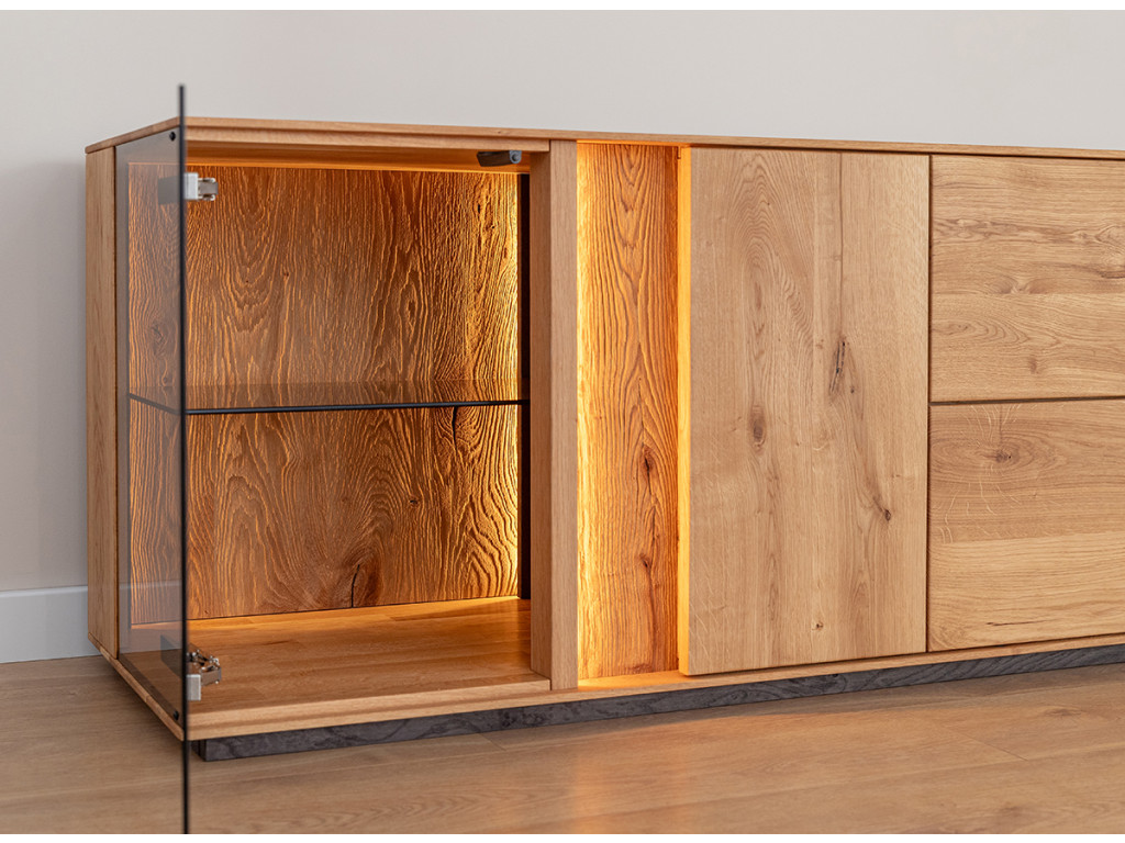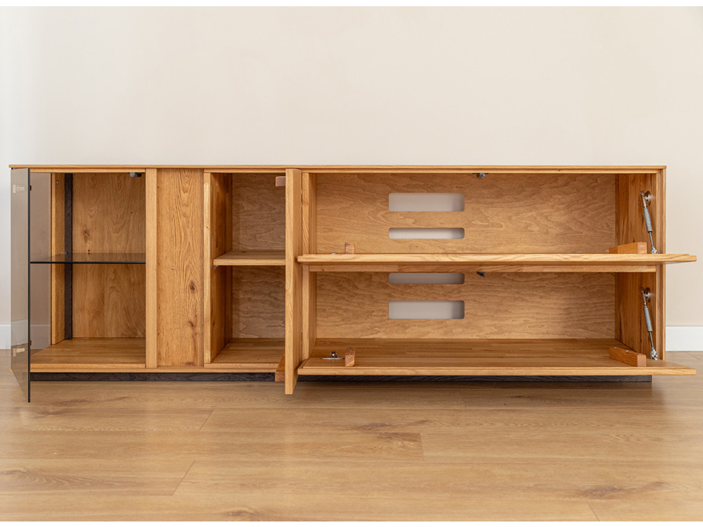 Masívny TV stolík Collodi z dubového dreva ponúka nadčasový dizajn a tiež dostatok úložného priestoru. Disponuje 2 skrinkami s výklopnými dvierkami, jednou skrinkou s plnými dvierkami a jednou skrinkou so sklenými dvierkami. V zadnej časti skriniek vpravo sa nachádzajú výrezy na prestup káblov. Nábytok môžete ľubovoľne skombinovať s ďalšími kusmi z kolekcie Collodi, napríklad s vitrínami alebo komodami a dotvoriť si tak harmonický interiér, kde sa budete cítiť skutočne doma.