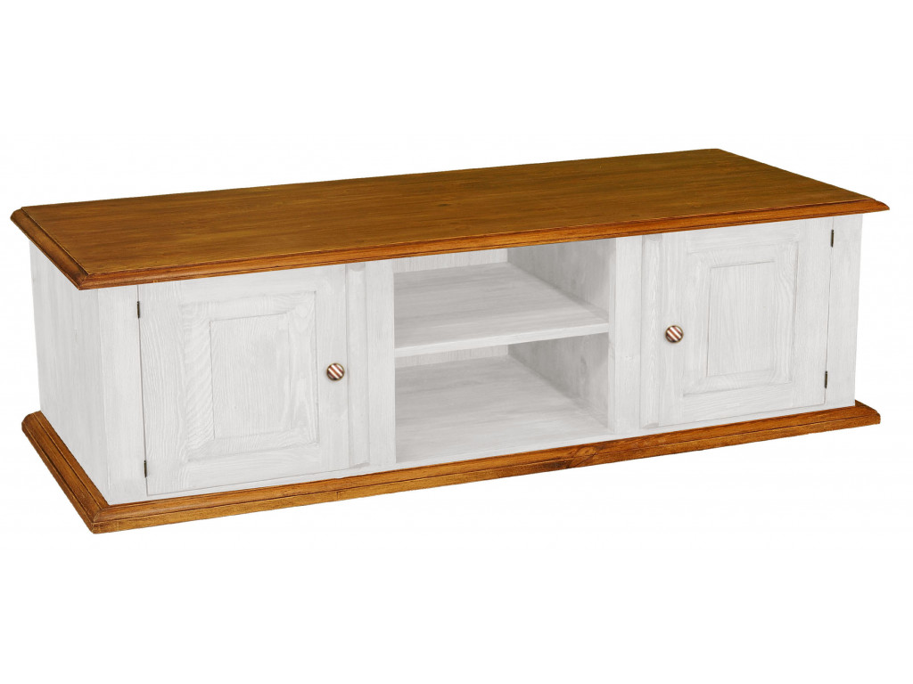 Chýba vašej obývačke televízny stolík z masívu? Tento praktický kúsok poteší majiteľov 4 malými zásuvkami s kovovými rukoväťami na drobnosti a 2 otvorenými priehradkami v strede.Či už bude váš televízor priamo položený na stolíku alebo zavesený na stene nad ním, obývačke dopraje útulný vidiecky charakter.