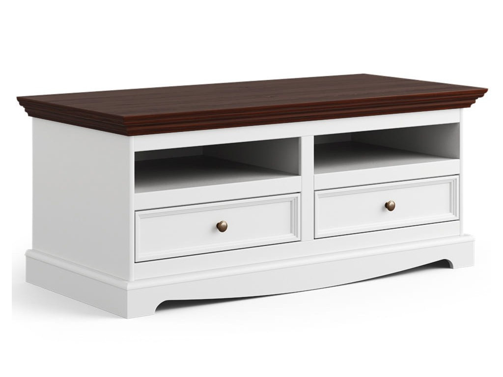 Klasický a mimoriadne elegantný biely TV stolík poskytne nielen priestor pre televízor, ale ozdobí aj mnoho interiérov v provensálskom štýle. Má 2 zásuvky na drobnosti a 2 otvorené police pre televízne zariadenia. Je vyrobená z borovicového dreva.