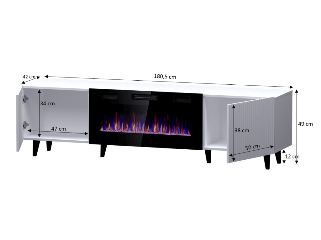 Biely TV stolík s integrovaným elektrickým LED krbom ponúka úložný priestor za dvierkami na oboch stranách a moderný, čistý dizajn. Čierne plastové nožičky dodávajú kontrast a stabilitu, vďaka čomu je stolík štýlovým doplnkom každej obývačky.