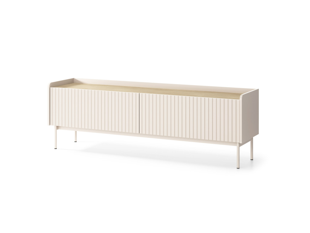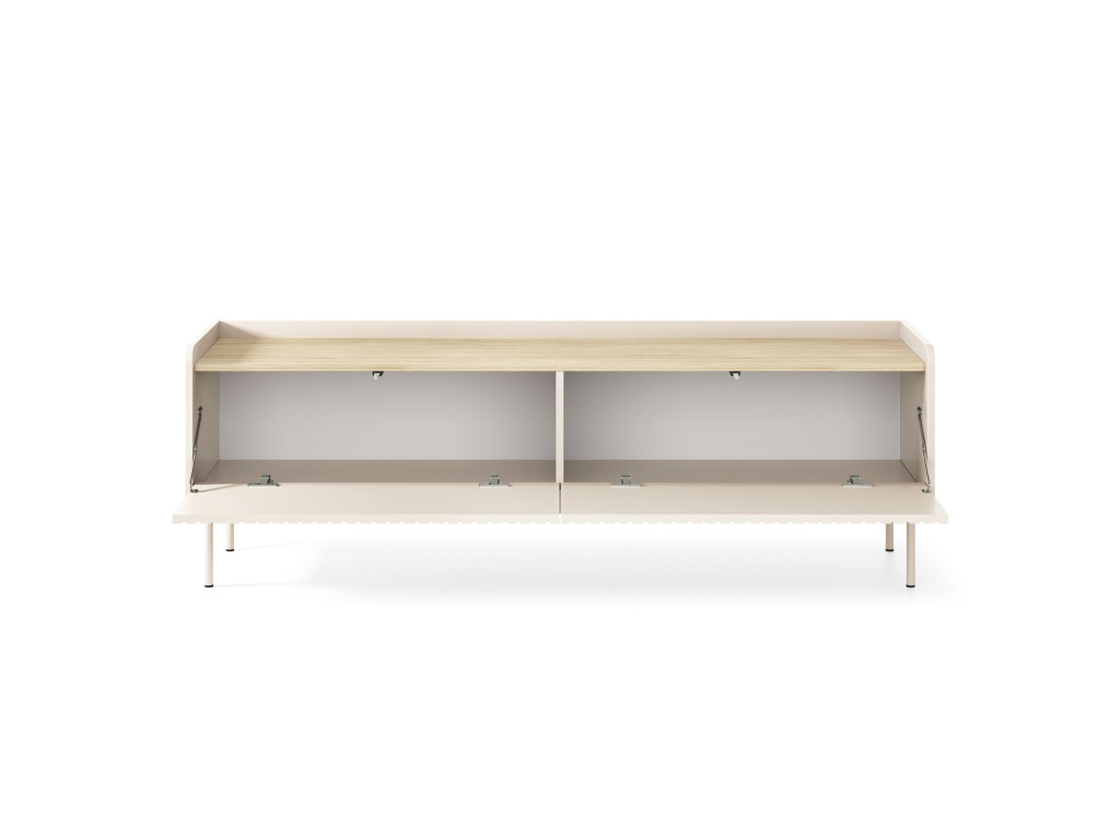 TV stolík stojí na kovových nožičkách v zodpovedajúcej béžovej farbe. Tie sú pevné a stabilné, no zároveň, dodávajú štýlový vzhľad. Výhodou nábytku na nožičkách je aj jednoduché čistenie pod ním.
