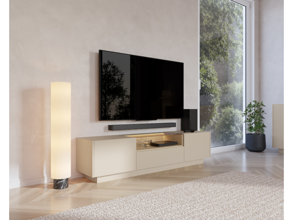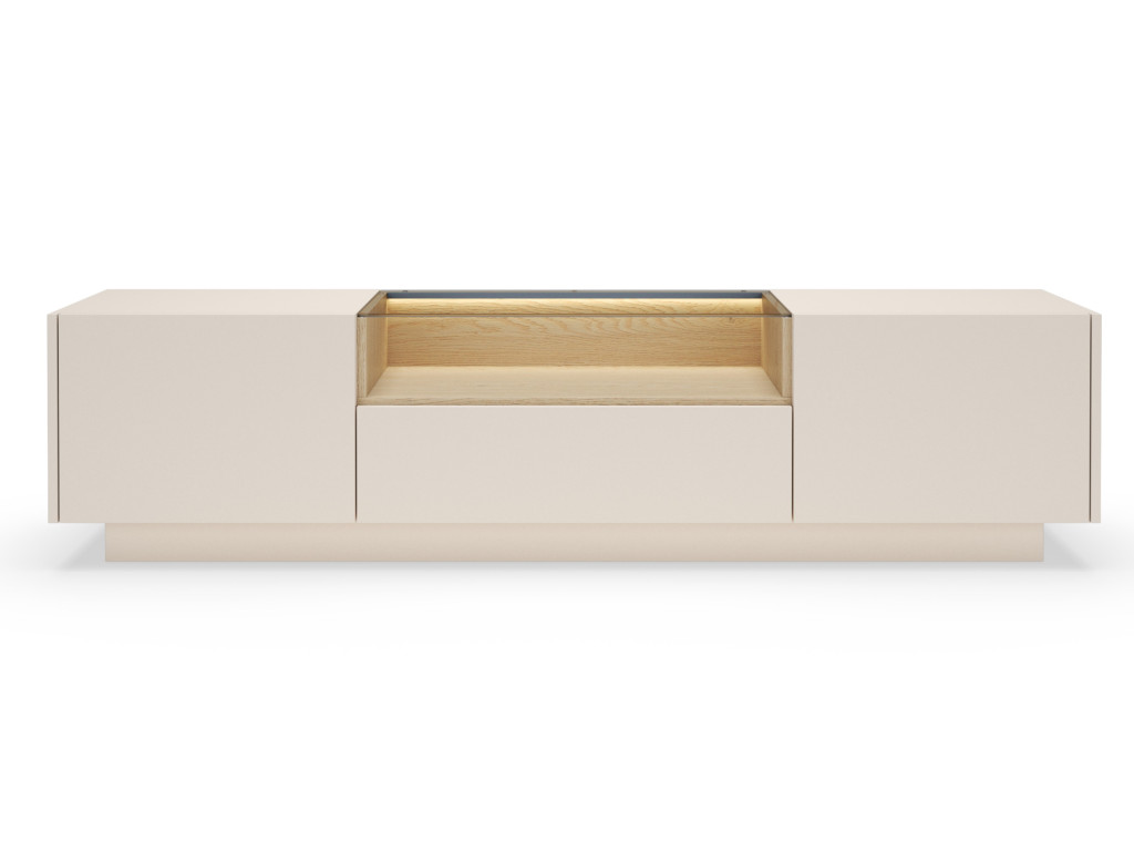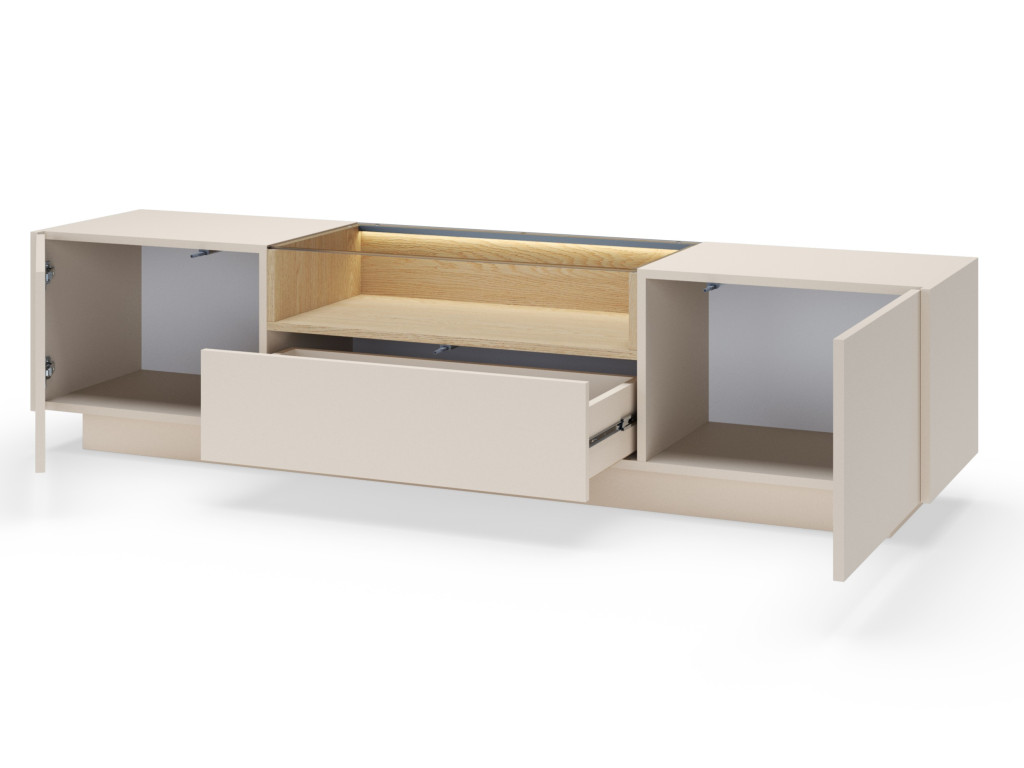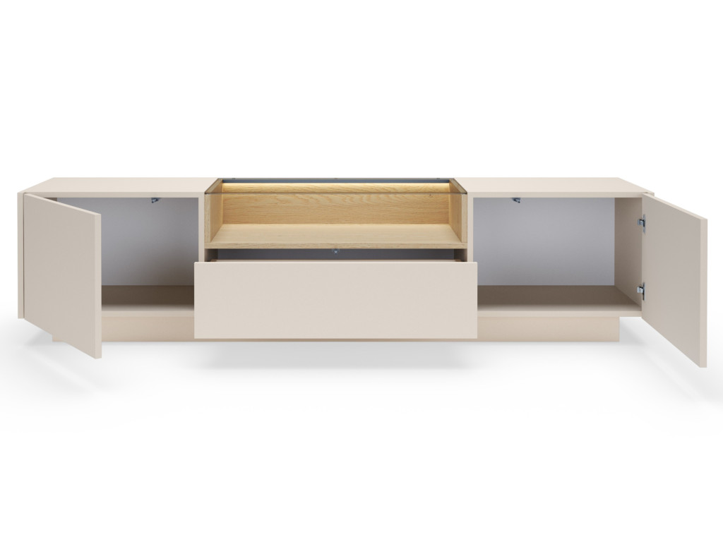 TV stolík disponuje dvomi bočnými skrinkami s dvierkami, stredovou zásuvkou a otvorenou poličkou nad ňou. Hornú časť tvorí sklenená plocha s integrovaným LED osvetlením. Vyhotovený je v kombinácii béžová / dub krémový s dôrazom na moderný dizajn bez úchytiek. Otváranie je riešené pomocou push-to-open systému.