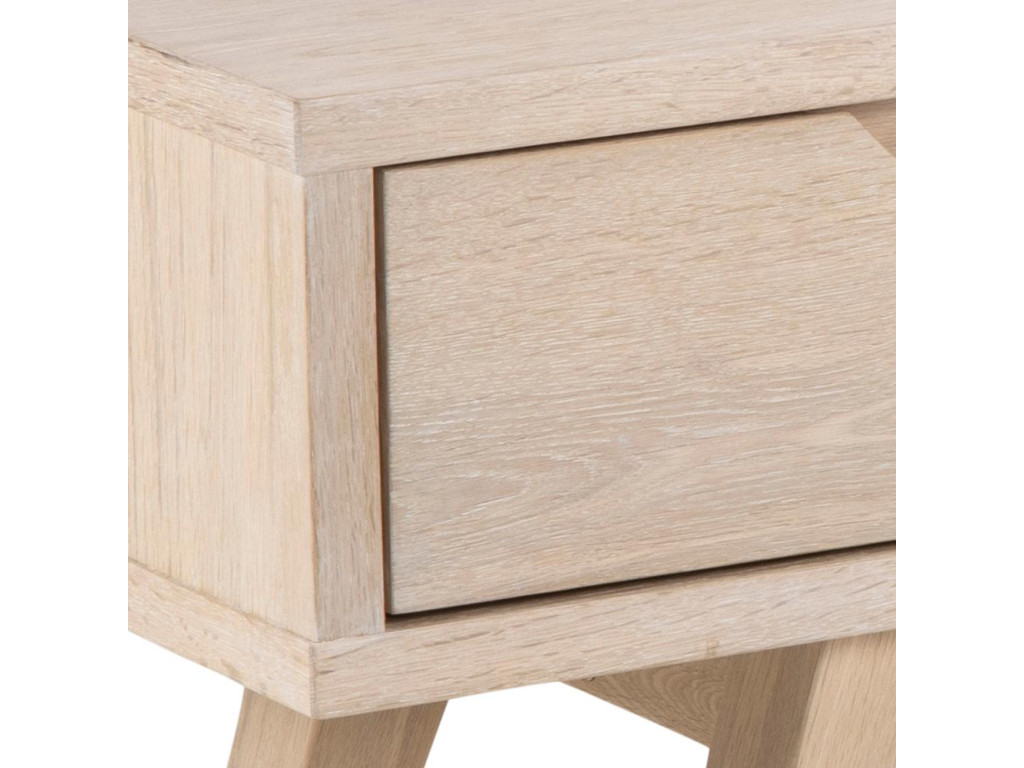 TV stolík A-Line prináša do obývačky škandinávsku ľahkosť: čisté línie, štíhly profil a teplý odtieň bielo pigmentovanej, olejovanej dubovej dyhy. Dve priestranné zásuvky s integrovanými úchytkami spoľahlivo ukryjú ovládače či herné príslušenstvo, zatiaľ čo otvorená polica ponechá miesto pre soundbar alebo set-top box. Vysoké, zúžené nohy z masívneho dubu dodávajú vizuálnu ľahkosť a uľahčia upratovanie pod stolíkom.