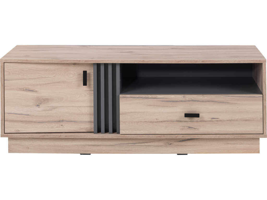 Celý stolík je vyrobený v modernom dizajne, takže zapadne do každej obývačky. Disponuje otvorenou policou, zásuvkou a skrinkou. Je vyrobený z laminovanej drevotriesky zakončenej ABS hranami vo farbe antracit a dub estana.