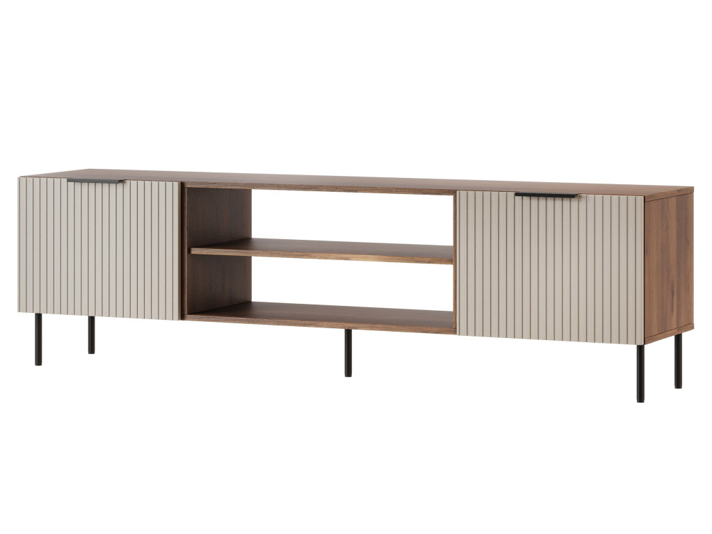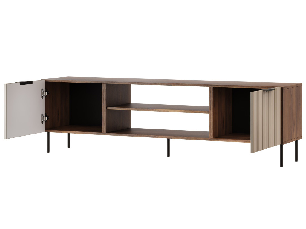 TV stolík Almera 6 v prevedení béžová / orech ponúka praktické úložné riešenie v elegantnom dizajne. Dve bočné skrinky, otvorená stredová polica a stabilné kovové nožičky vytvárajú funkčný doplnok modernej obývačky s nadčasovým vzhľadom.