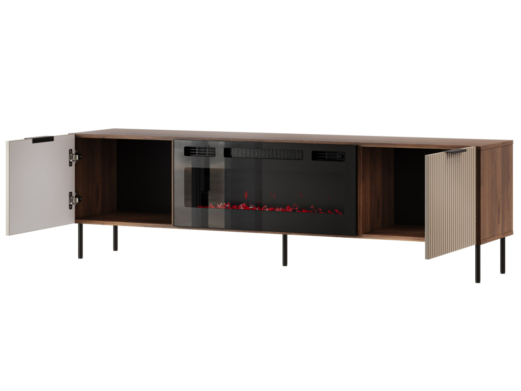 Stolík disponuje dvomi bočnými dvierkami otváranými do strán, pričom za každými sa nachádza samostatný úložný priestor vhodný na uloženie televízneho príslušenstva či doplnkov. Stredná časť je vyplnená integrovaným elektrickým LED krbom, ktorý vytvára príjemnú, útulnú atmosféru bez potreby komína a robí zo stolíka výrazný dizajnový prvok interiéru. Čierne kovové úchytky podčiarkujú moderný charakter nábytku a zabezpečujú pohodlné používanie.