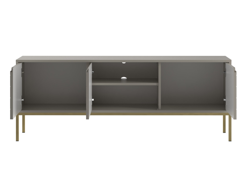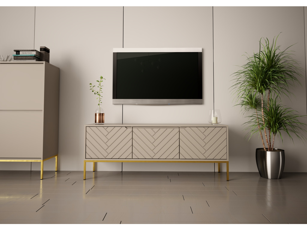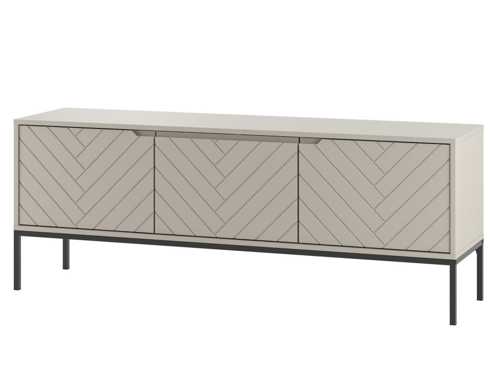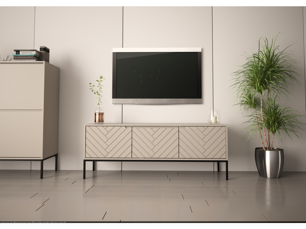 TV stolík Aspen 01 z kolekcie Aspen v jemnej matnej béžovej farbe vnáša do interiéru teplý a harmonický nádych. S jeho frézovanými čelami so stromčekovým vzorom a čistými líniami bez úchytiek dokonale zapadne do moderných aj minimalistických priestorov. Stolík má šírku 151 cm a ponúka tri praktické dvierka s tichým dovieraním pre maximálne pohodlie.