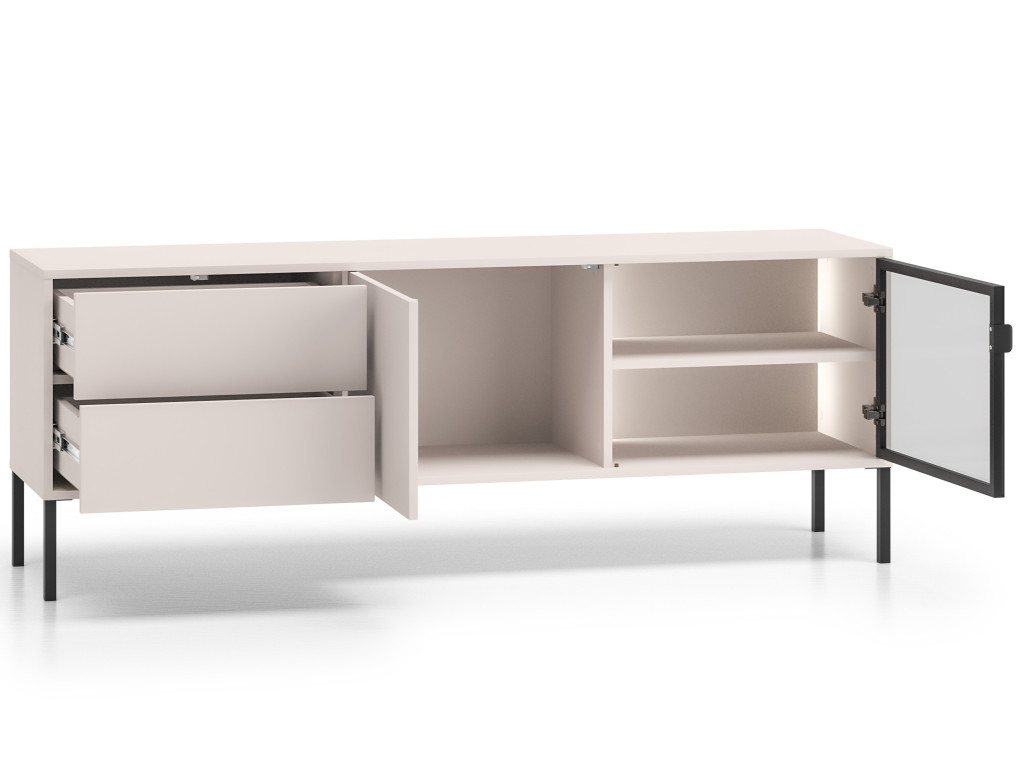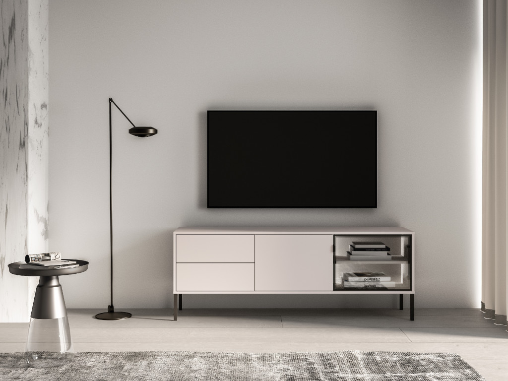 TV stolík Barnee 04 je prakticky riešený úložný prvok určený pre multimediálne vybavenie. Disponuje dvomi zásuvkami s otváraním push, ktoré umožňujú pohodlné uloženie príslušenstva. Dopĺňajú ich dve dvierka, z ktorých jedno je sklenené, vhodné na umiestnenie elektroniky alebo dekorácií. Kombinácia uzavretých a presklených častí vytvára prehľadné a funkčné usporiadanie priestoru.