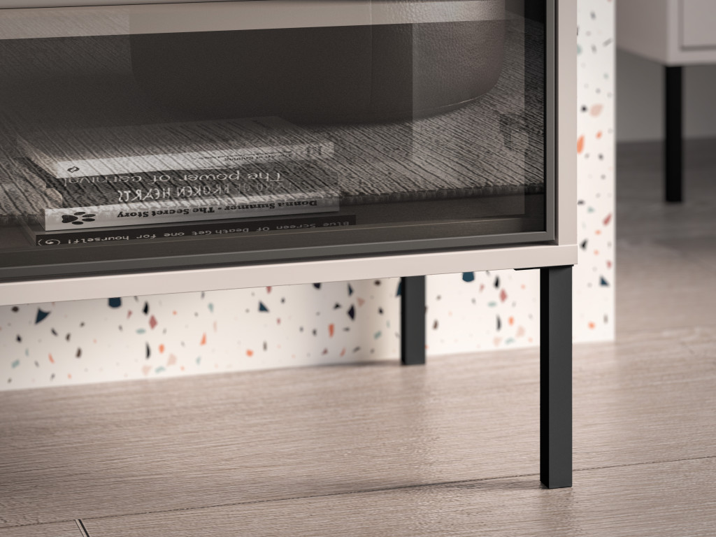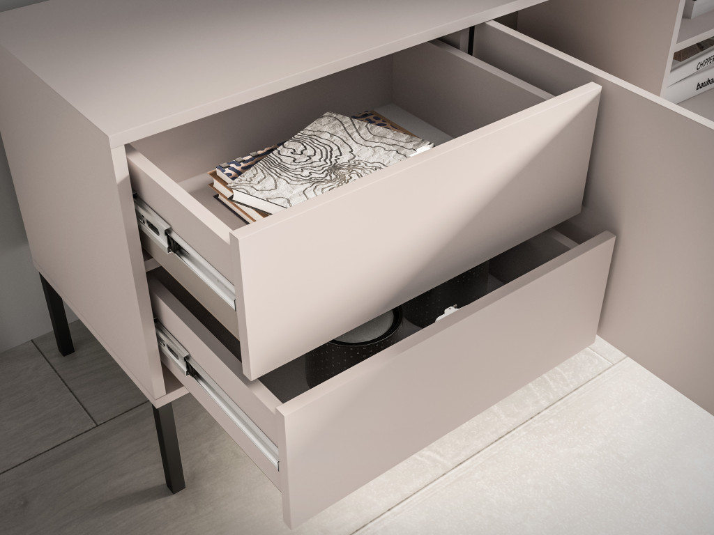Čierny kovový rám a vysoké kovové nohy dodávajú nábytku moderný industriálny akcent a zároveň uľahčujú upratovanie. Guľôčkové pojazdy zabezpečujú plynulý chod zásuviek a ich úplný výsuv, čo zvyšuje komfort každodenného používania.