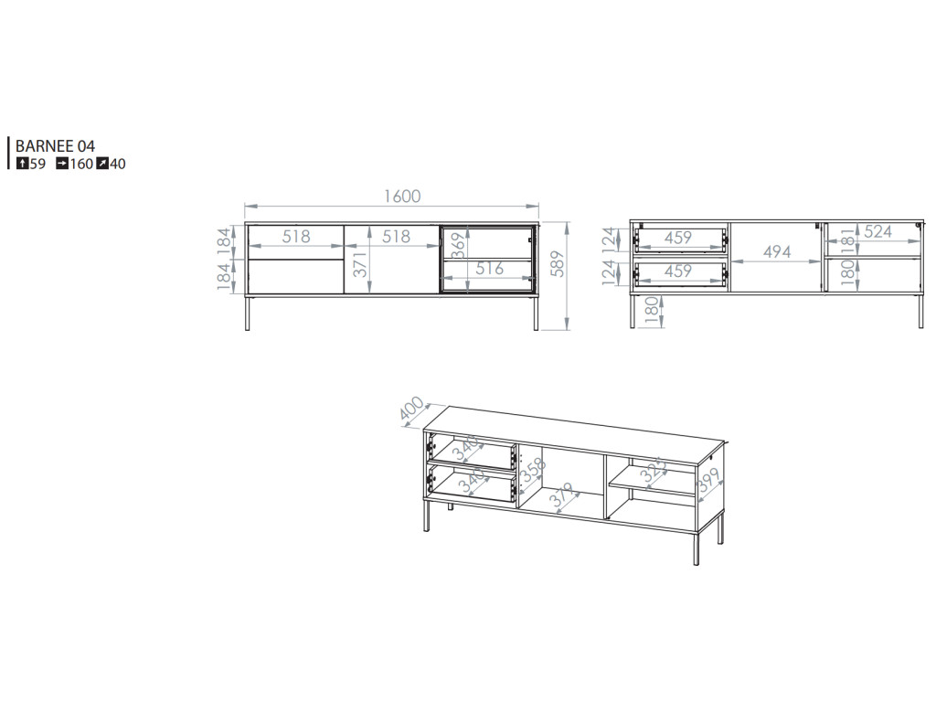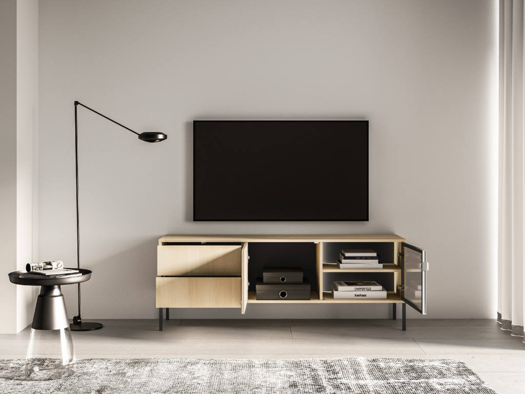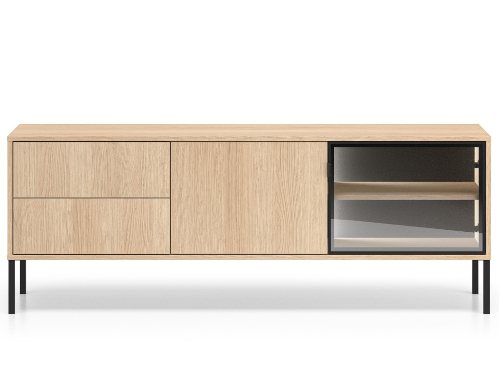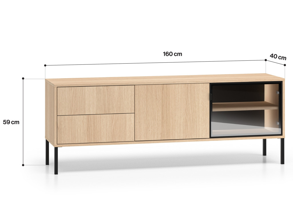TV stolík Barnee 04 je prakticky riešený úložný prvok určený pre multimediálne vybavenie. Disponuje dvomi zásuvkami s otváraním push, ktoré umožňujú pohodlné uloženie príslušenstva. Dopĺňajú ich dve dvierka, z ktorých jedno je sklenené, vhodné na umiestnenie elektroniky alebo dekorácií. Kombinácia uzavretých a presklených častí vytvára prehľadné a funkčné usporiadanie priestoru.