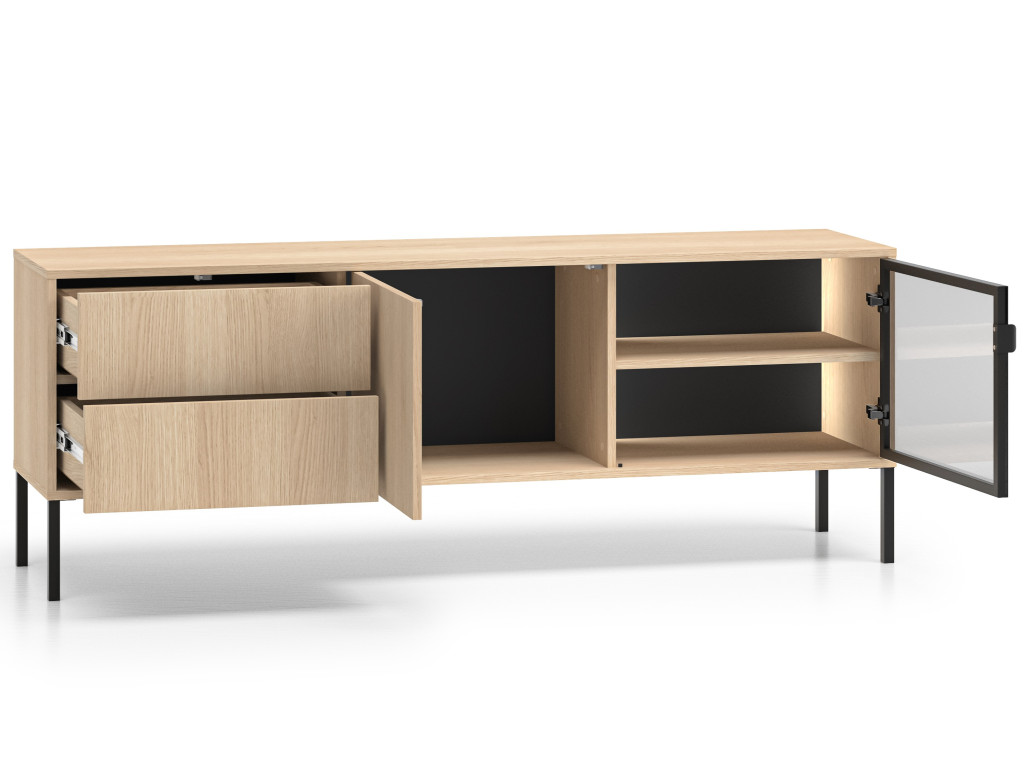 Čierny kovový rám a vysoké kovové nohy dodávajú nábytku moderný industriálny akcent a zároveň uľahčujú upratovanie. Guľôčkové pojazdy zabezpečujú plynulý chod zásuviek a ich úplný výsuv, čo zvyšuje komfort každodenného používania.