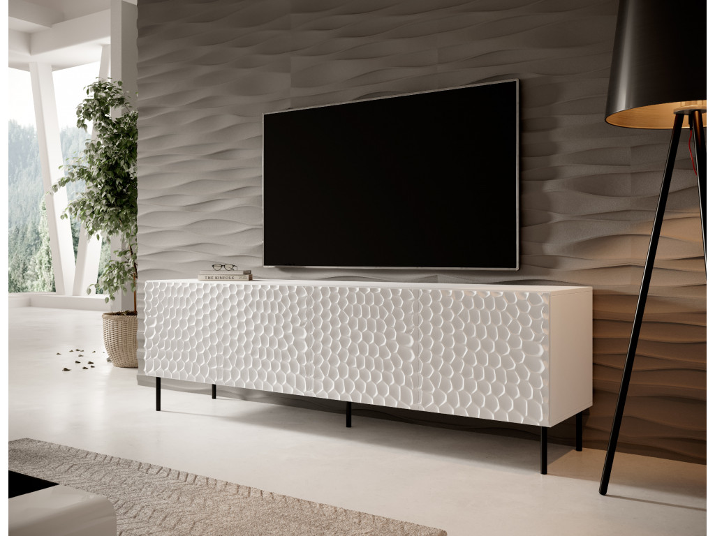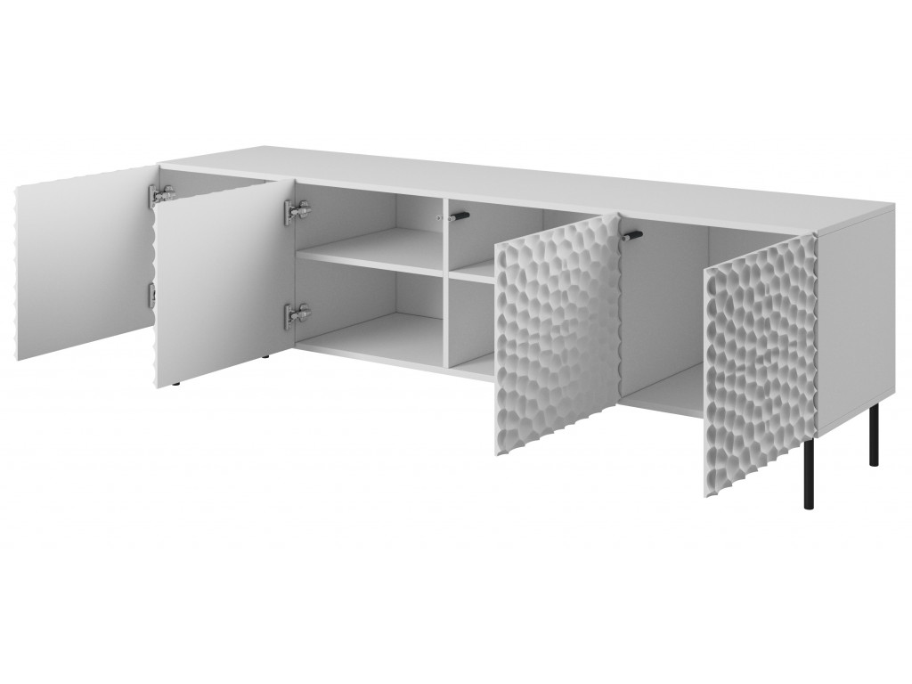TV stolík je praktickou súčasťou každej obývačky. Či už hľadáte minimalistický stolík do veľkej alebo malej obývačky, tento TV stolík bude tou správnou voľbou. Matnú bielu farbu dopĺňa zaujímavý detail a to jamky na predných čelách dvierok. Vďaka nim vyzerá stolík unikátne a elegantne. Je vybavený 6 priestrannými policami. Dvierka sú vybavené systémom Push to open