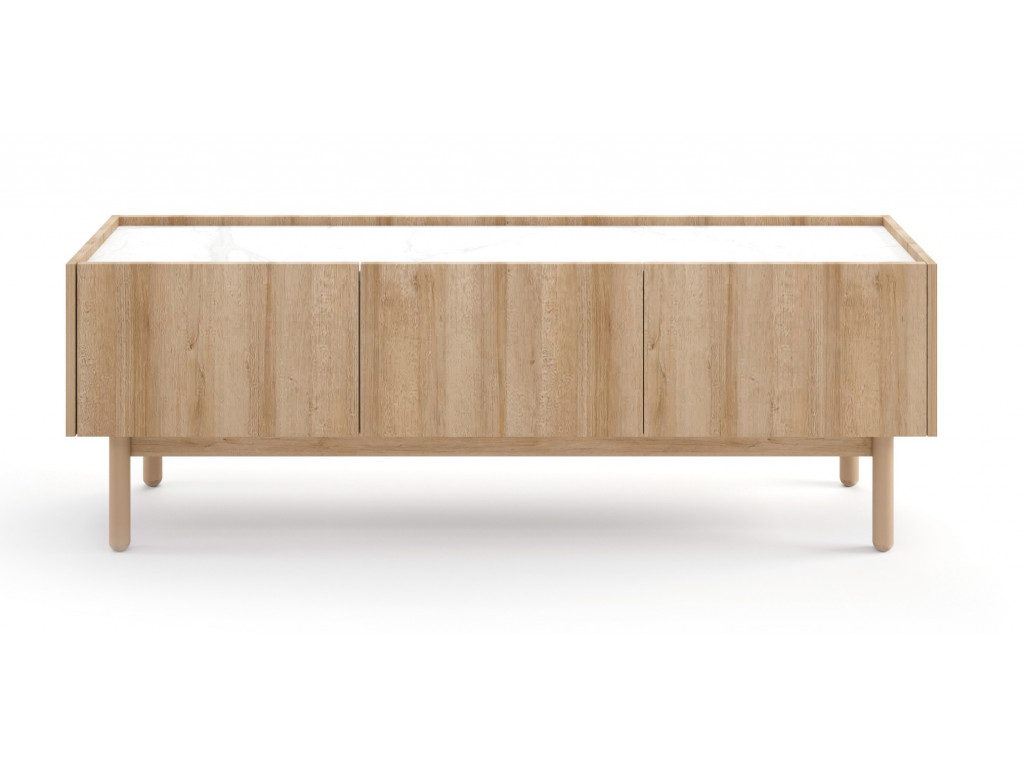Stolík v odtieni dub riviera dopĺňa dizajnová vrchná doska s mramorovým dizajnom v bielej farbe. Kombinácia prírodnej farby a mramoru vnesie do interiéru originálny dizajn. TV stolík nemá úchytky, otvára sa pomocou vyčnievajúcich dvierok, ktoré presahujú vrchnú dosku. Korpusy aj dvierka sú olepené ABS páskou na predĺženie životnosti nábytku. Korpusy a čelá sú vyrobené z kvalitnej drevotrieskovej dosky hrubej 16 mm.