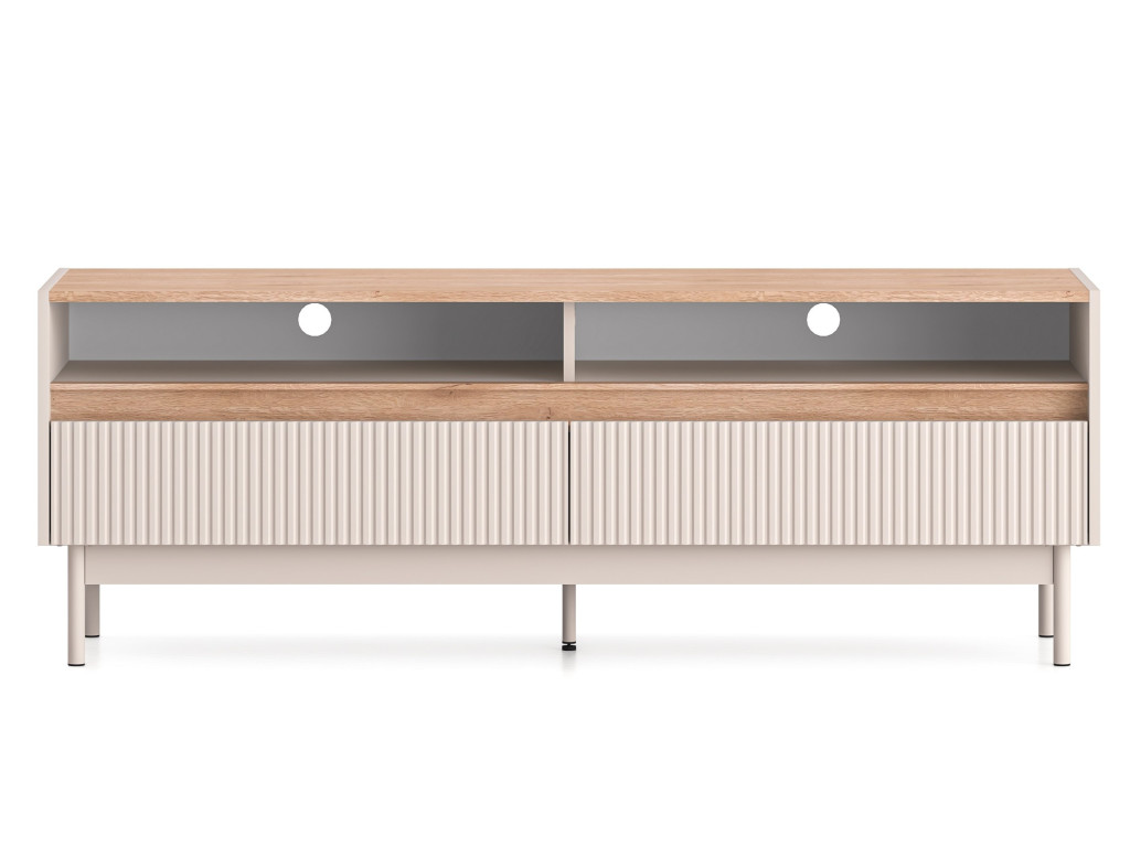 Štýlový TV stolík Dunea s 2 zásuvkami a otvorenými poličkami ponúka priestor na televízor aj multimediálne zariadenia. Elegantná kombinácia kašmírovo béžovej a dubu krémového zapadne do moderného interiéru.