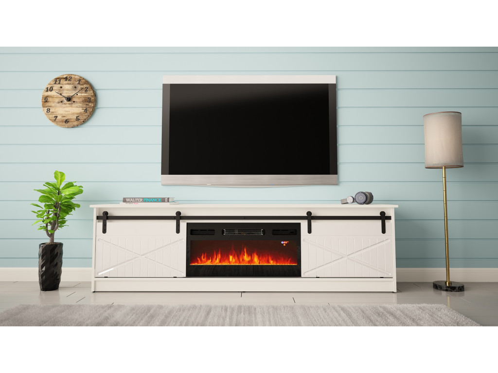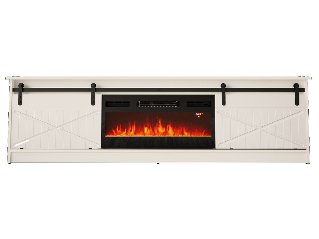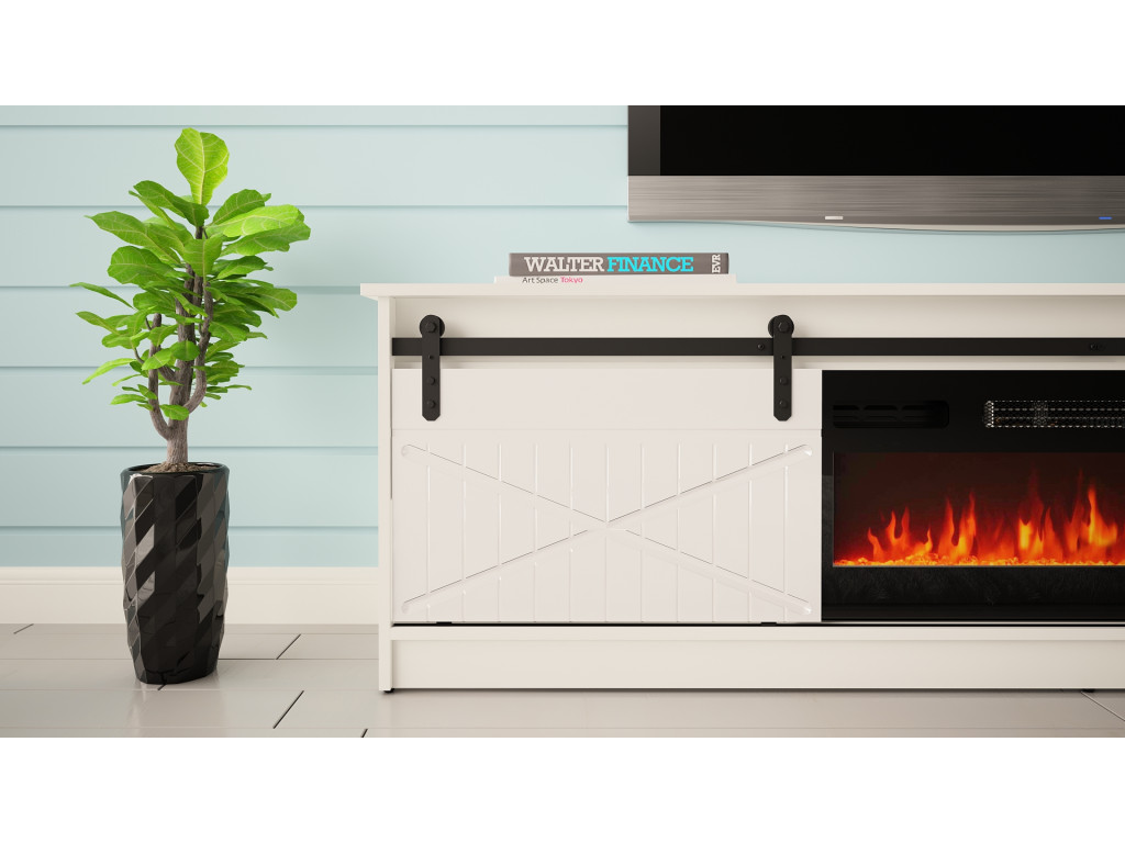 Rustikálny TV stolík vyniká precíznym spracovaním a dôrazom na detail. Posuvné dvierka na kolieskach s frézovaním do tvaru X dodávajú nábytku originálny charakter, pričom štyri bočné police poskytujú praktický úložný priestor. Stredná časť je vyplnená elektrickým LED krbom EF-800020 v čiernej farbe, ktorý vytvára príjemnú atmosféru bez potreby komína. Kontrast lesklej bielej farby a čiernych koľajníc podčiarkuje štýlový rustikálny vzhľad.
