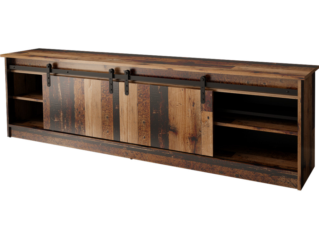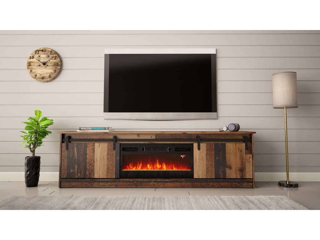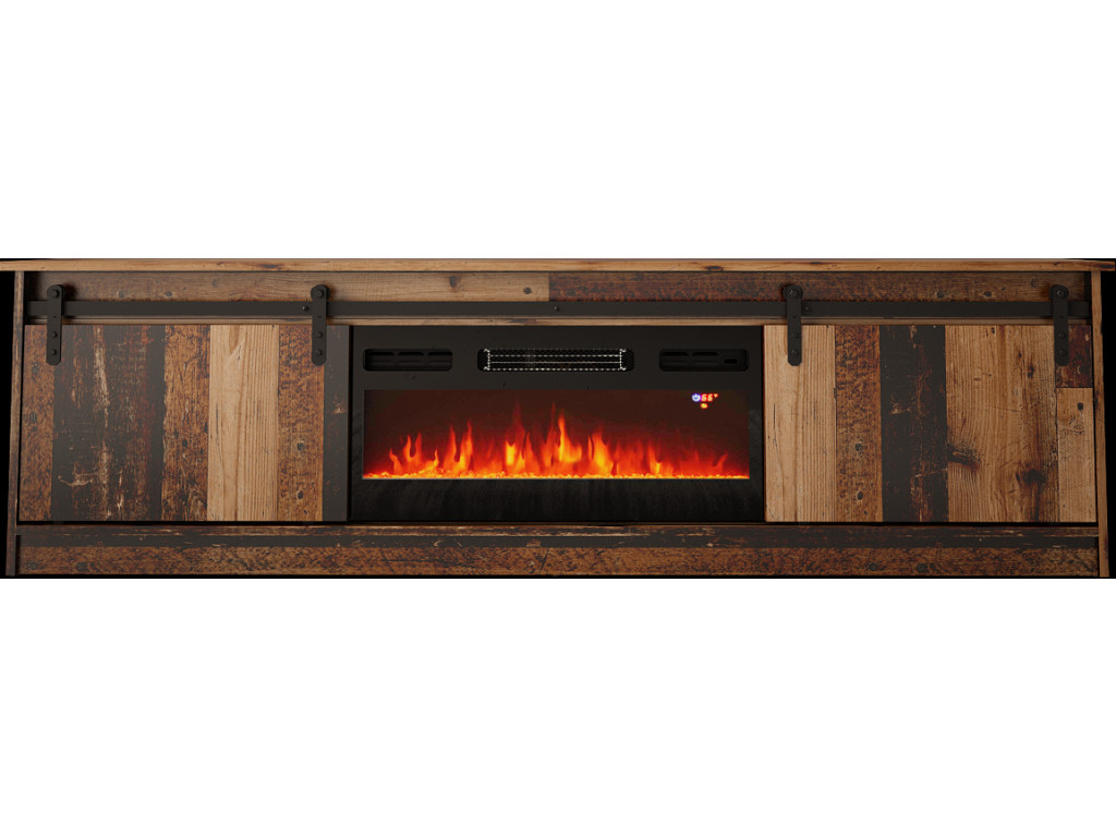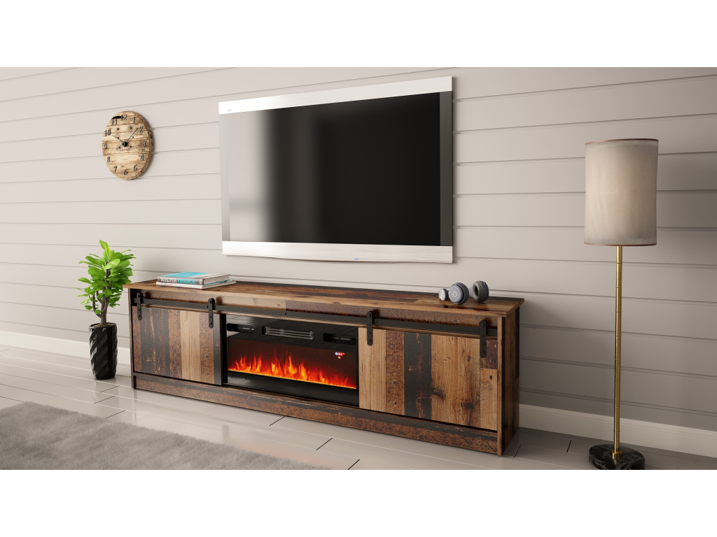 Dizajnový TV stolík v rustikálnom štýle je výrazným prvkom interiéru, ktorý zaujme posuvnými dvierkami s historickým charakterom. Ponúka dostatok úložného priestoru na televízne príslušenstvo a ide o produkt s integrovaným elektrickým LED krbom EF-800020, ktorý vytvára príjemnú atmosféru bez potreby komína.