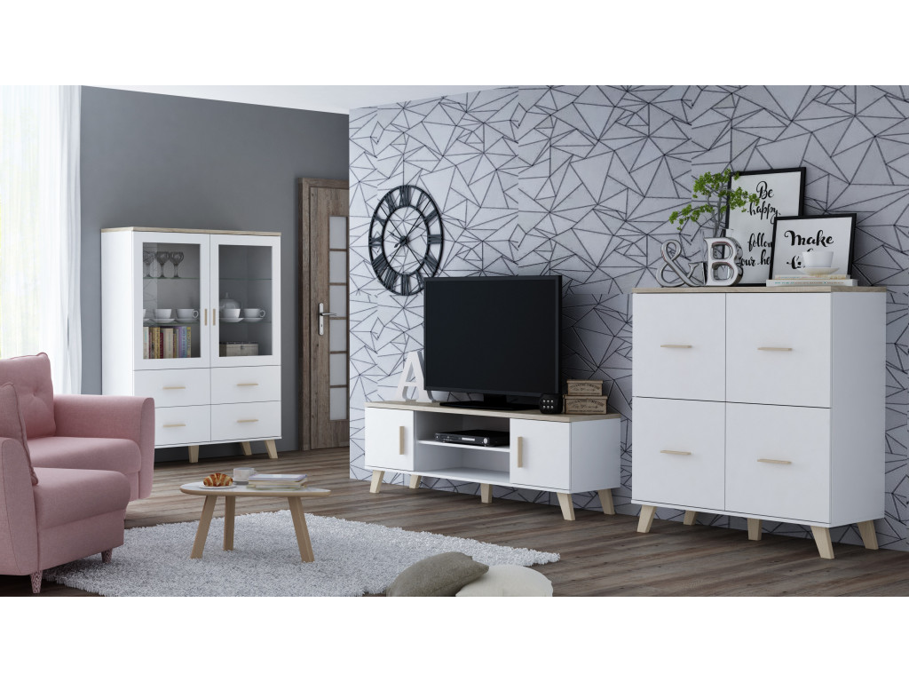 Biely stolík pod TV Lotus zažiari v každej obývačke. Biela matná farba v kombinácii s dubovými nožičkami a úchytkami vnesie do interiéru príjemný teplý dizajn. Stolík je vybavený 2 otvorenými policami na televízne príslušenstvo a 2 skrinkami.