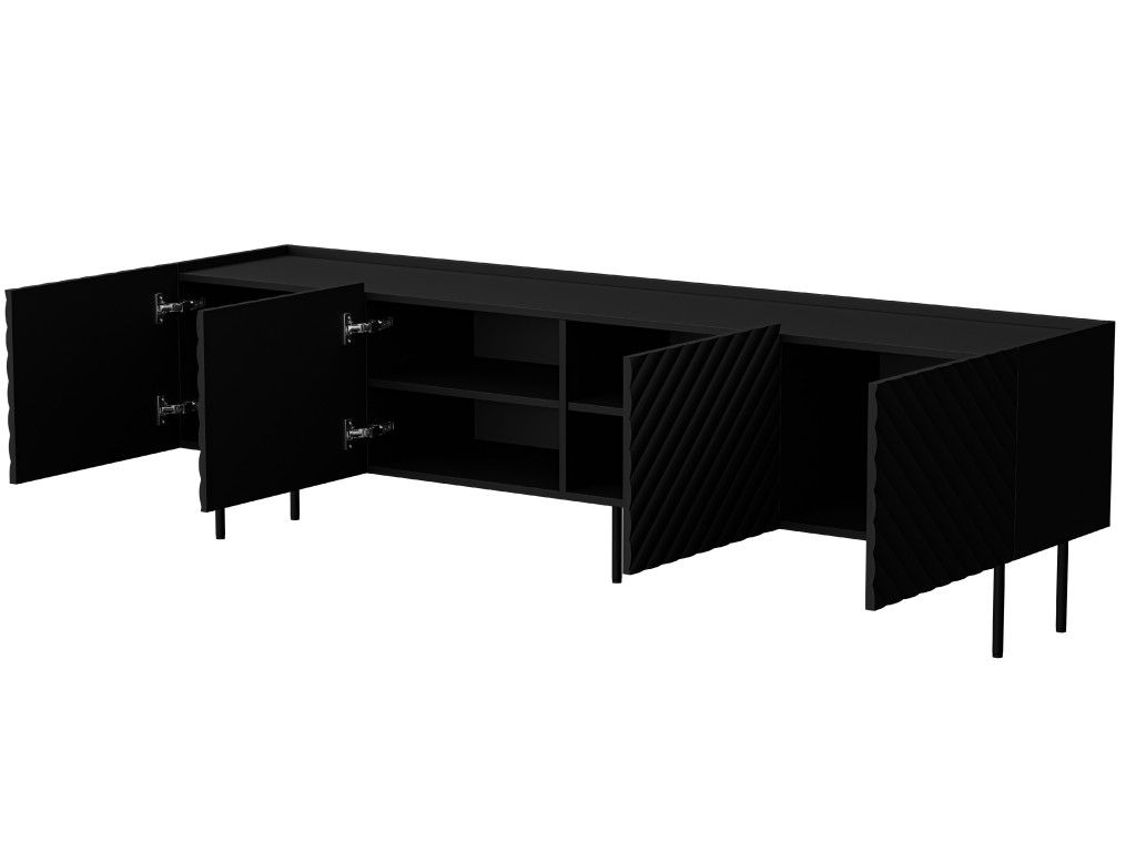 Čierny TV stolík Lucia 200 vyniká elegantným, kontrastným vzhľadom a stane sa dominantou každej obývačky. Štruktúrované čelá s diagonálnym frézovaním pôsobia moderne a výrazne. Vysoké nožičky uľahčia čistenie aj manipuláciu. Ideálny pre milovníkov odvážneho dizajnu.
